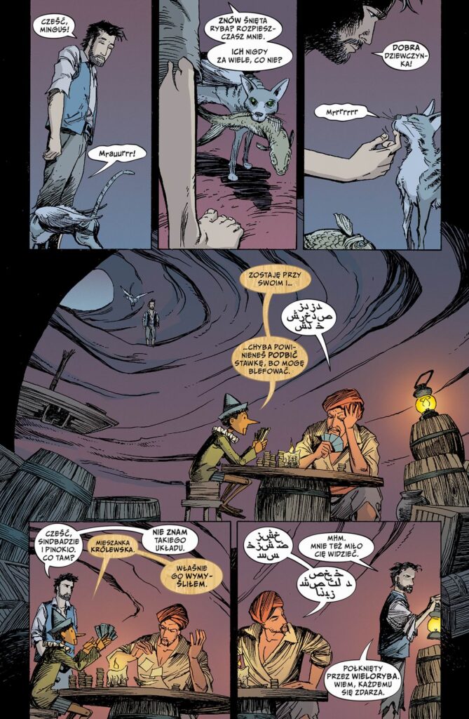 Mimo tych wszystkich atrakcji, wciąż podczas lektury nie opuszcza nas przeświadczenie, że cała ta opowieść to rodzaj popisówki, chwalenia się zdolnością mieszania w literackim tyglu. I dopiero coś w tej kwestii zmienia się w ostatniej dłuższej opowieści z niniejszego tomu, zatytułowanej “Lewiatan” (tą rzeczywiście ostatnią opowieścią są “Schody do nieba”, mocno alegoryczna historia z maszerującymi po niekończących się schodach gadającymi zwierzakami). To tutaj wreszcie Tom i Lizzie mają chwilę oddechu, zatrzymują się w tym pełnym biegu wydarzeń i zachowują jak zwykli ludzie, a nie fikcyjni bohaterowie (dla przeciwwagi mamy Richarda, który zachowuje się jak pełnoprawny, popkulturowy bohater).