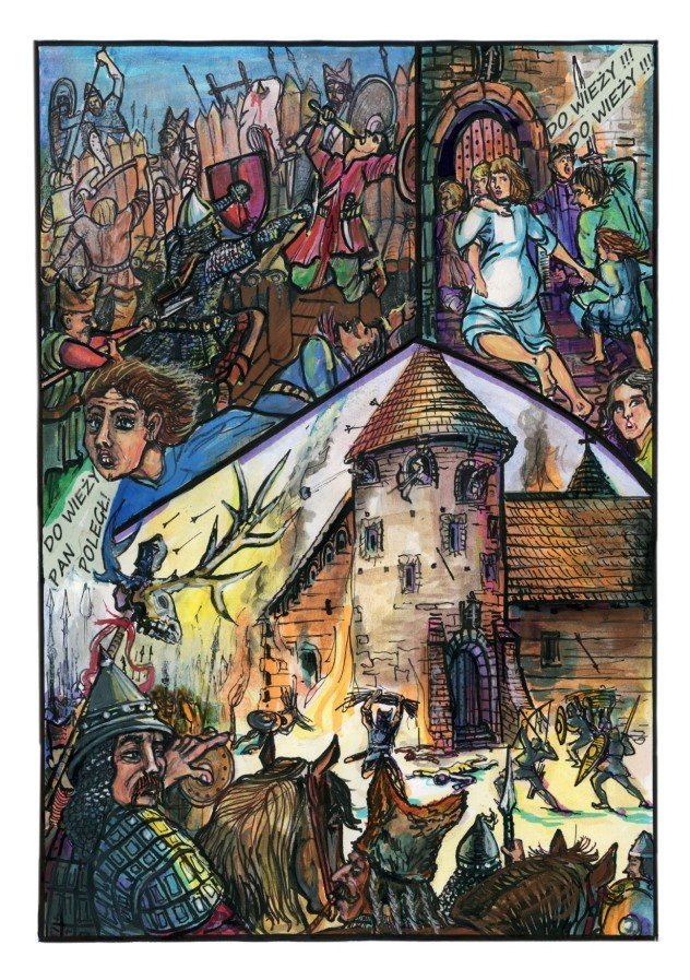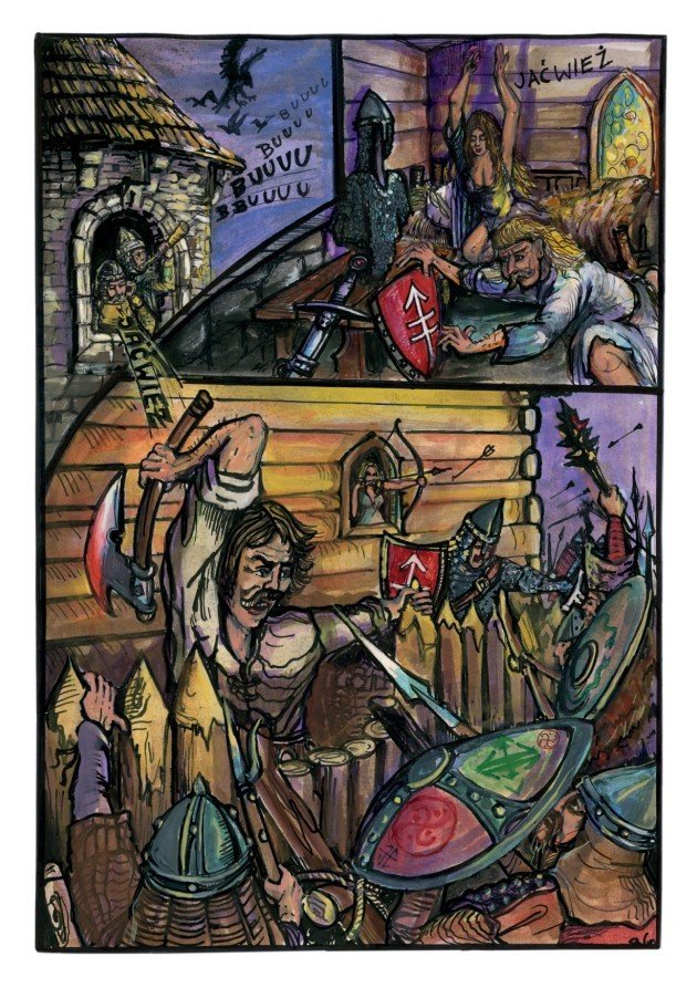 Komiks obfituje w bitwy, pościgi i zasadzki. Pojawiają się w nim również postacie historyczne. Akcję kończy wielka bitwa rycerstwa Małopolskiego z Jaćwingami.