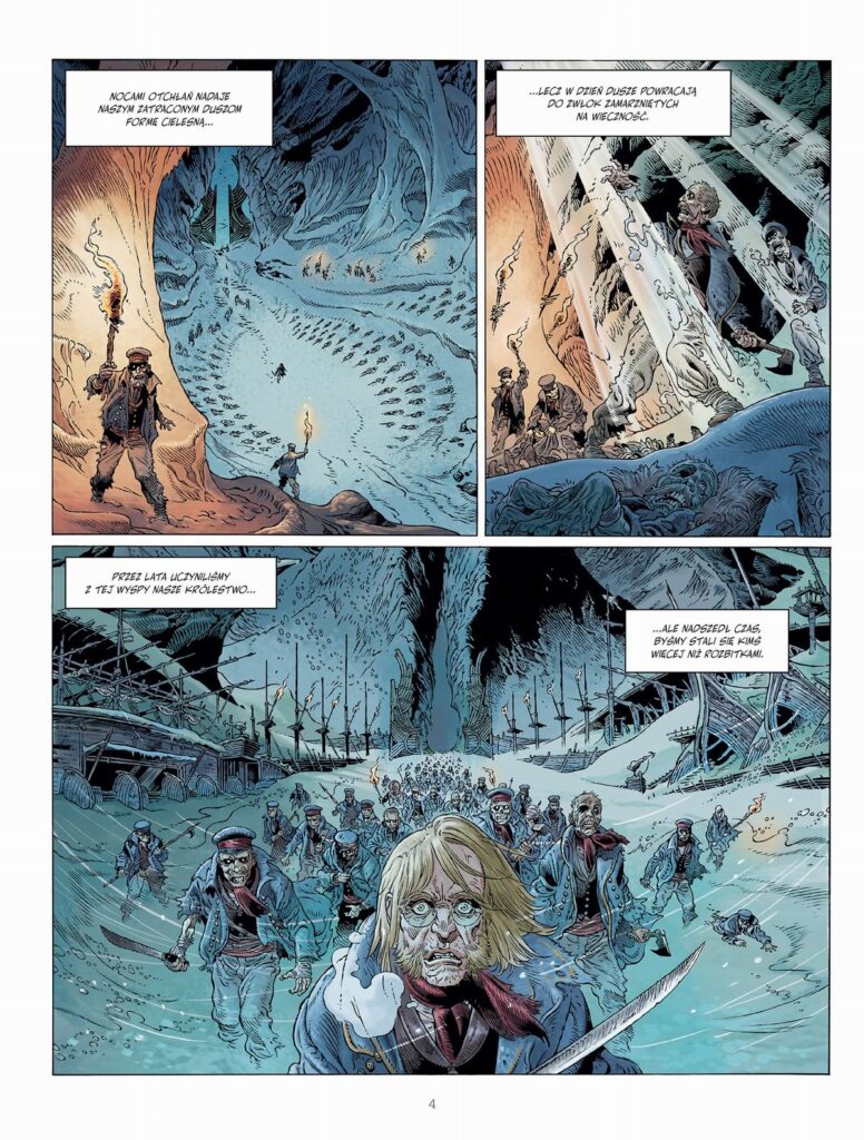Tempo, które napędza akcję, zbiera też pewne żniwo w atmosferze. „Otchłań zmartwychwstań” aż prosi się, by od czasu do czasu zwolnić i zatrzymać się na dłuższą chwilę przy obrazie lodowych rumowisk czy przy skrzypiącymi pod stopami płytami zamarzniętego oceanu, tak by pozwolić czytelnikowi naprawdę zanurzyć się w chłodzie, poczuć wszechobecne zagrożenie i dać się otoczyć grozie wynikającej z pustki i ciszy. Nie jest to więc typ horroru, który wzbudzi gęsią skórkę samą atmosferą. Jeśli jednak zaakceptujemy fakt, że nie jest to dzieło straszące subtelną aurą, a raczej dynamiczny horror przygodowy, historia zaczyna działać naprawdę dobrze. Do pewnego stopnia czyta się to momentami jak mroźną wariację na temat „Piratów z Karaibów” — co prawda pozbawioną humoru, skierowaną do dorosłych czytelników, osadzoną w znacznie bardziej nieprzyjaznej scenerii i uzupełnioną o pokaźna dawkę brutalności, dzięki detalicznym kadrom Gabriela Rodrigueza, ale mającą w sobie ten sam pierwiastek niczym nieskrępowanej przygody.