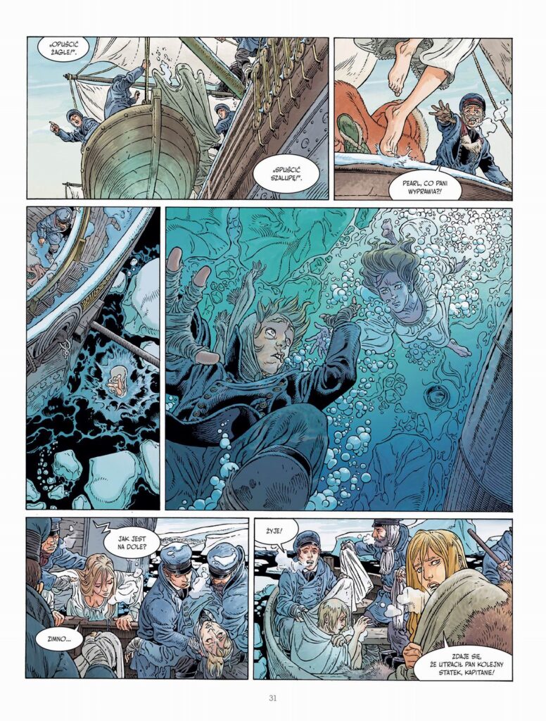 Zaproponowana przez HiroDjee fabuła albumu zaczyna się szybko i bez zbędnych ornamentów. Autor one shotów „Naissancedutigre” i „Okanikaa” nie marnuje czasu na przesadny wstęp: mamy tu krótkie, lecz sugestywne wprowadzenie w realia XIX wieku, z jego sztywnymi społecznymi konwenansami i motywacjami, które popychają bohaterów do działania. Lord Haven Greenwood wyrusza na wyprawę ku nieznanemu, kierowany mieszaniną naukowej ciekawości, obsesji i pragnienia zapisania się w historii. Gdy mija czas, a wieści od ekspedycji przestają napływać, jego żona Pearl wyrusza na północ, by odnaleźć męża i zrozumieć, co właściwie wydarzyło się na lodowych pustkowiach. W samej strukturze tej opowieści pobrzmiewają echa klasycznych narracji polarnych wypraw, ale bardzo szybko pojawia się element nadnaturalny — tytułowa otchłań, miejsce, w którym granice między życiem a śmiercią wydają się płynne, a ludzka psychika zaczyna ulegać nieludzkim siłom.