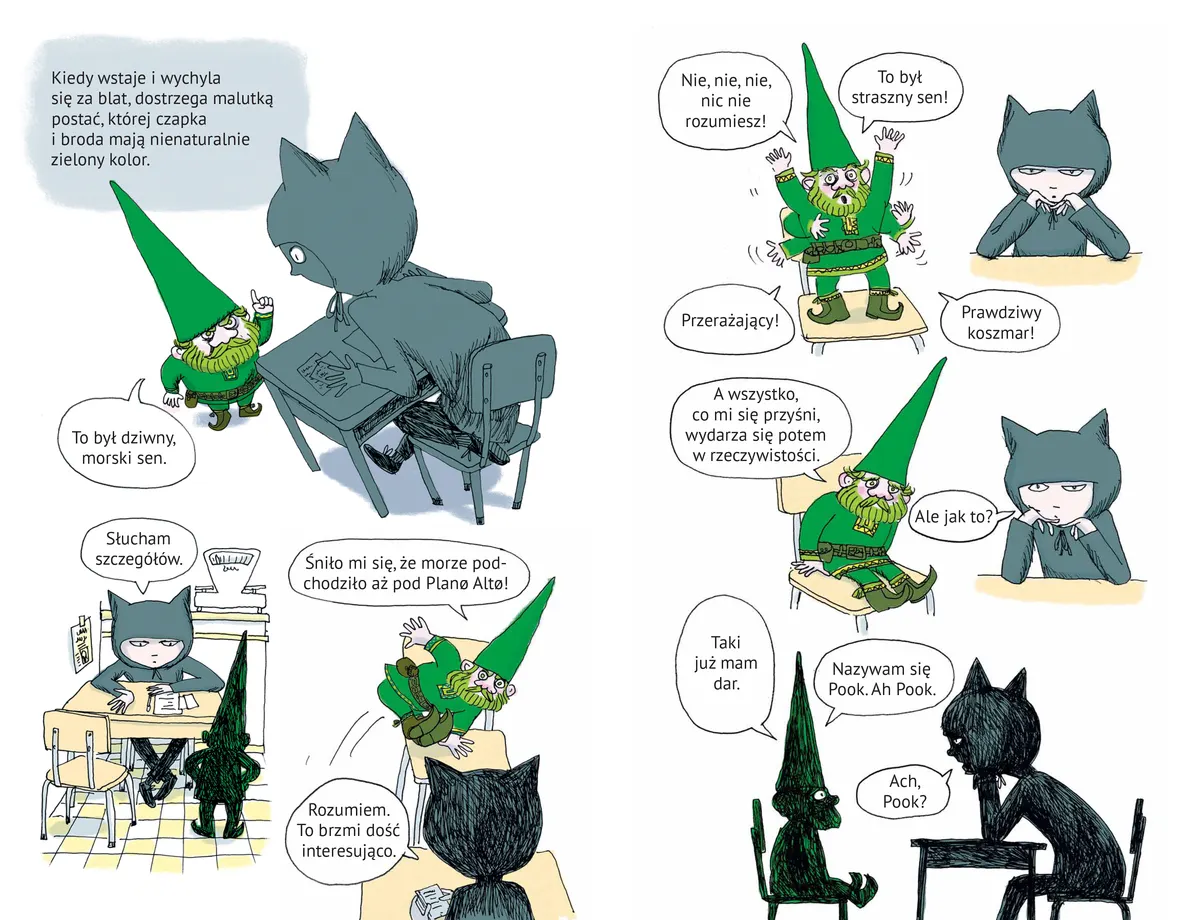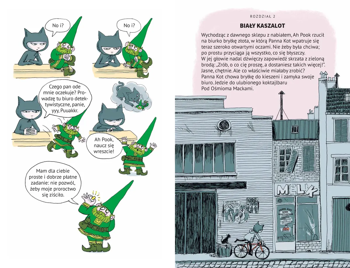 Prorocze sny, banda zielonych skrzatów, tajemniczy pisarz i plany zamachu na burmistrza? Oto drugie śledztwo Panny Kot – bohaterki serii bestsellerowych komiksów dla dzieci.