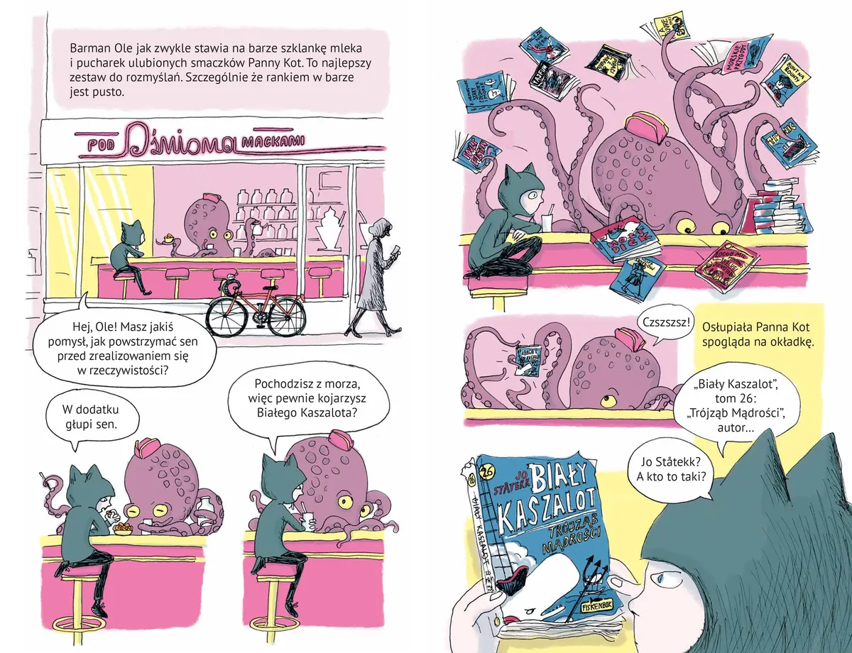Dynamiczna forma komiksu stylizowanego na skandynawski kryminał, wyrazista kreska Joëlle Jolivet i błyskotliwe dialogi Jeana-Luca Fromentala sprawiają, że od przygód Panny Kot nie sposób się oderwać. To idealna propozycja dla dzieci rozpoczynających samodzielną przygodę z czytaniem oraz dla wszystkich, którzy lubią tajemnice, czarny humor, osobliwych bohaterów i wciągające detektywistyczne śledztwa.
