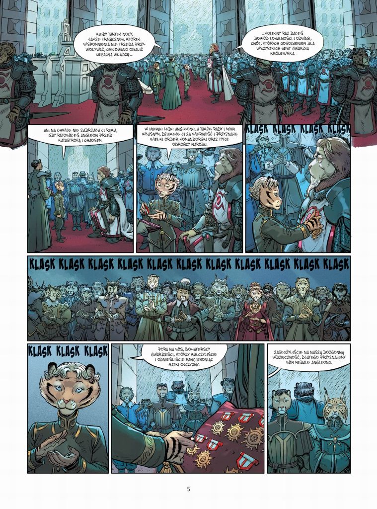 Tron Angleonu przypada młodemu Mederionowi, który rozpoczyna panowanie od stłumienia buntu lwów i wydania zaskakujących decyzji. Teraz jedni widzą w nim postępowego władcę, inni mają go za bezwzględnego tyrana. Jaka jest prawda? Nie zna jej chyba nawet nowy Cień Króla, lew Terys, a tym bardziej znakomity szermierz This, którego Mederion zatrudnił jako osobistego strażnika. Tymczasem po podziemiach stolicy błąka się grupa uciekinierów, a daleko od Angleonu najemnicy szukają księżniczki Astrelii,. Dlaczego ważnym osobom w państwie zależy na jej odnalezieniu?