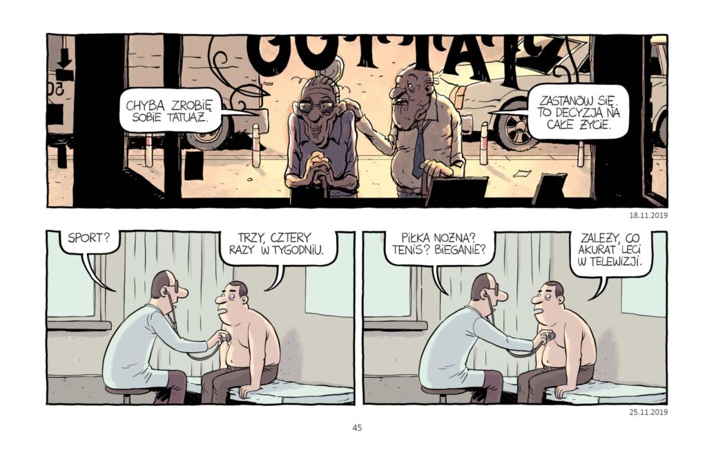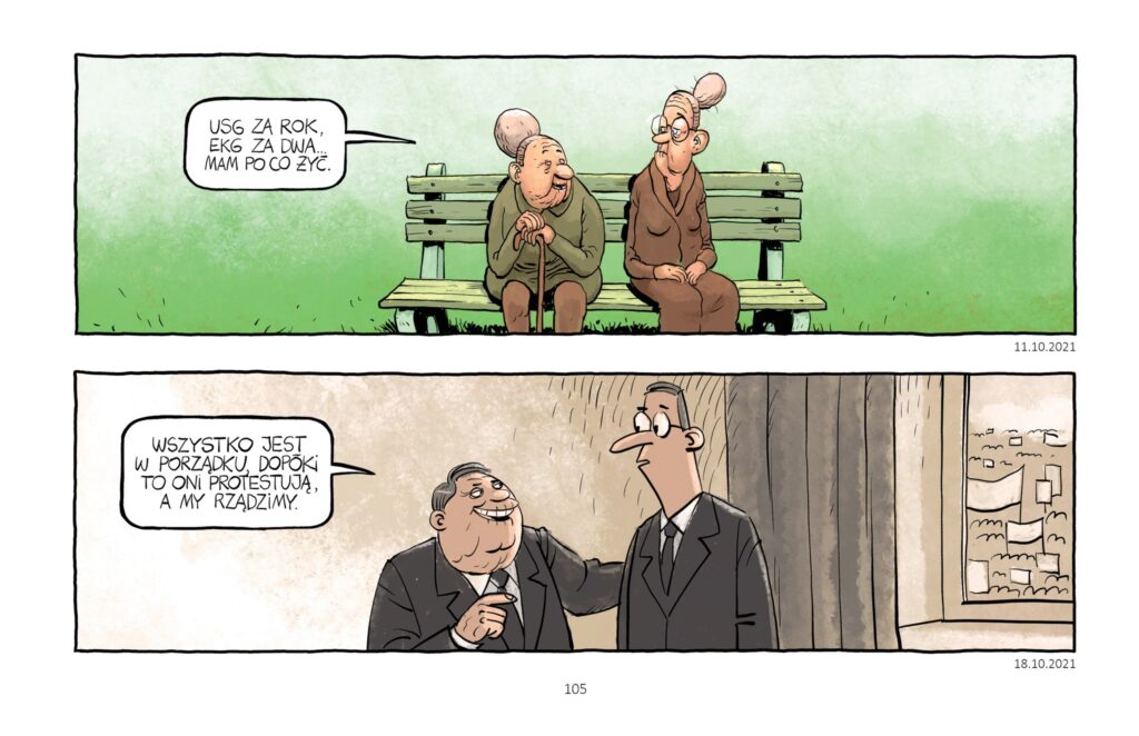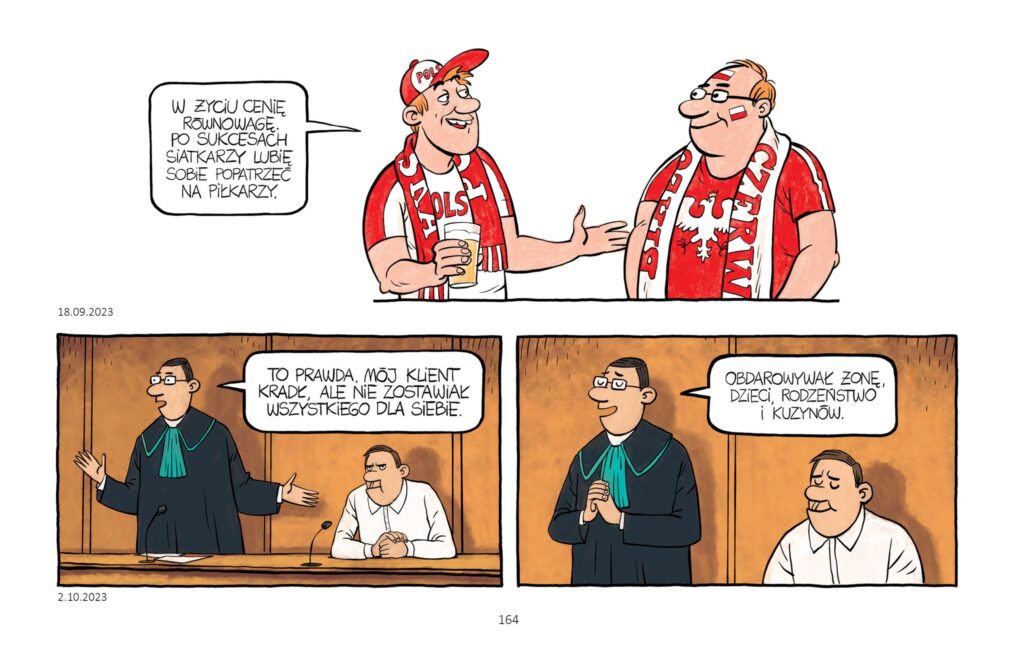Jedną z nich w prostych słowach streścić można tak: czym się strułeś, tym się lecz. I w tym właśnie duchu pragniemy zaproponować lekarstwo na wyżej wymienione bolączki i dolegliwości – jest nim, jakże by inaczej: pasek. Tym razem satyryczny, komiksowy. Chcemy zaznaczyć, że nie jest to terapia eksperymentalna – pasek Polska Mistrzem Polski był regularnie aplikowany w cotygodniowych porcjach Czytelnikom Dużego Formatu, a teraz, po raz drugi, trafia w opakowaniu zbiorczym, które pozwoli Państwu dawkować lekarstwo według indywidualnych potrzeb.