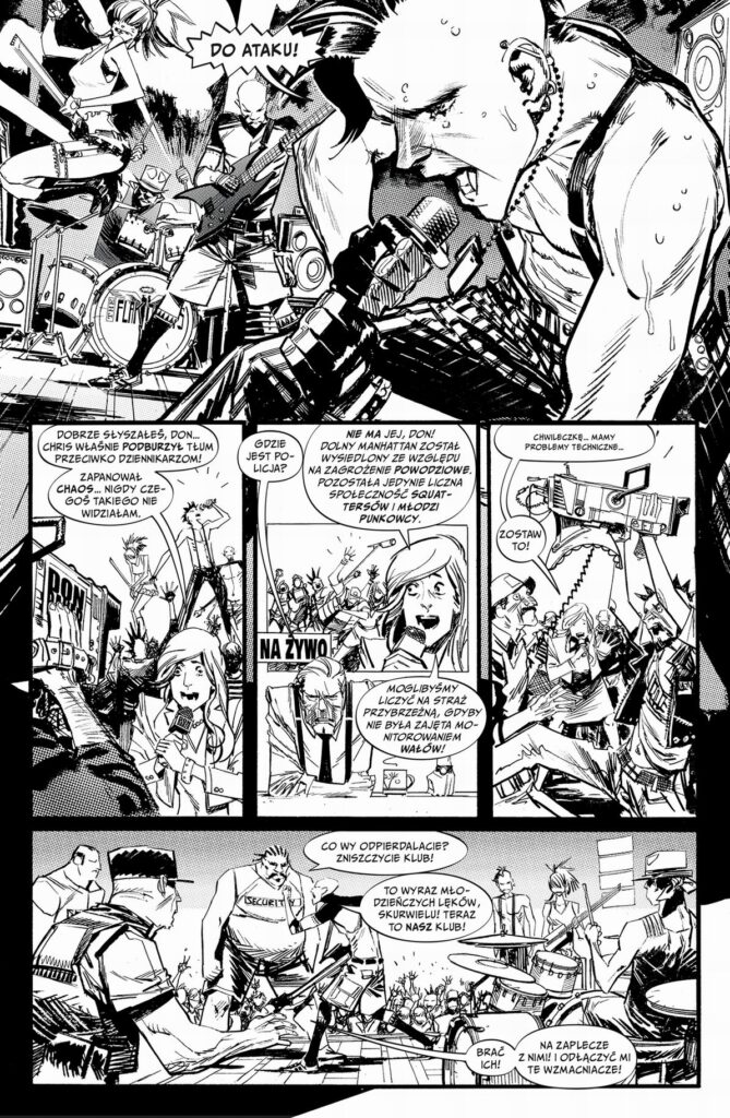 Sean Murphy jest na współczesnym, komiksowym firmamencie jasną gwiazdą. To utalentowany rysownik z własnym, rozpoznawalnym stylem, który również pisze ciekawe scenariusze, takie jak przebojowa seria o Białym Rycerzu, w którym eksploruje alternatywną wersję życiorysu Batmana i innych mieszkańców Gotham. Znamy w Polsce też inne komiksy z jego rysunkami, jak “Tokyo Ghost” czy ‘Przebudzenie’, w których warstwa graficzna świetnie współgra ze scenariuszem, a być może nawet go przebija. Podobne odczucia można miec podczas lektury ‘Punk Rock Jesus” - wydanie Egmontu bardzo udanie wyeksponowało talent graficzny autora - jego rysunki możemy podziwiać tym razem w czarno-białej wersji, bo w takiej formie został opublikowany ów komiks. Przewracając strony nie raz wzdychamy w zdumieniu lub podziwie nad dynamiczną kreską Murphy'ego, nad jego charakterystycznym tuszowaniem i obsesją kreskowania twarzy bohaterów - już samo to sprawia, że historia wydaje się ostrzejsza niż jest w rzeczywistości. A jeszcze mamy niezwykle bogate dodatki, które pozwalają przeczytać o genezie komiksu i dają szczegółowy wgląd w proces twórczy. Nieczęsto mamy do czynienia z takimi wydaniami i należy ów fakt mocno docenić.