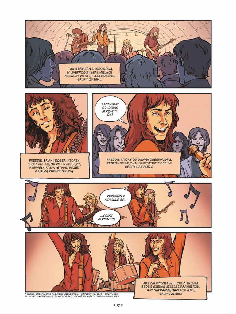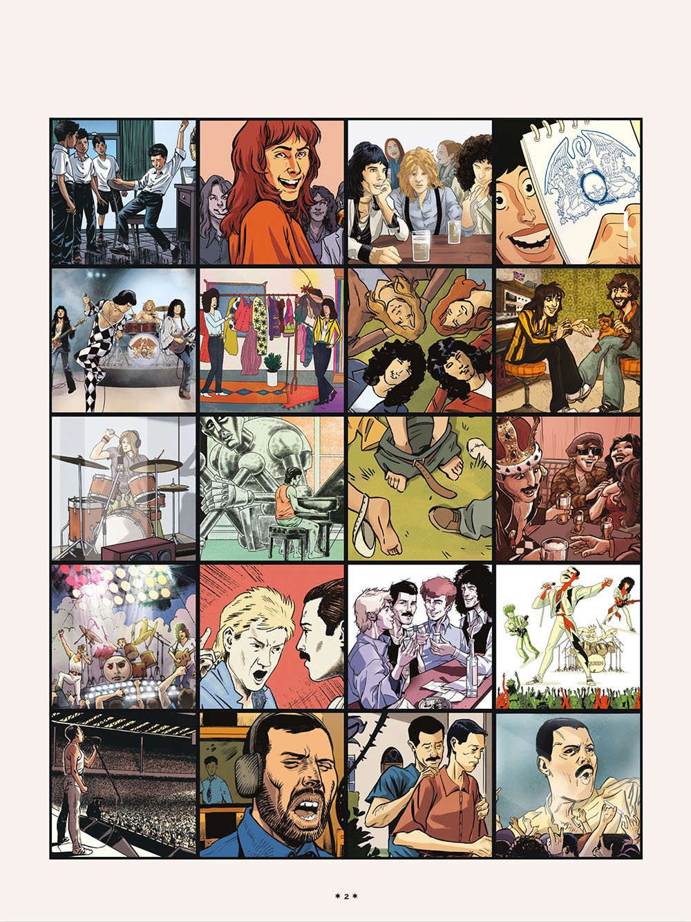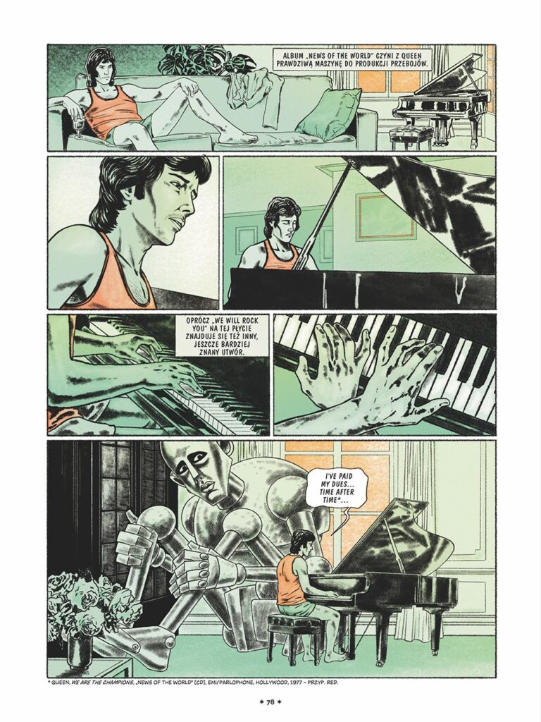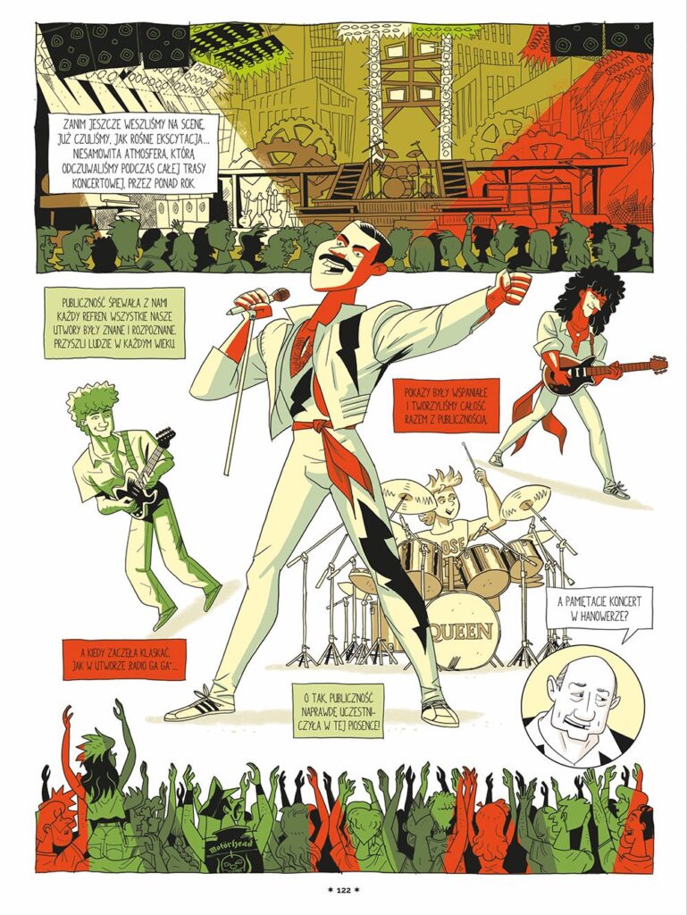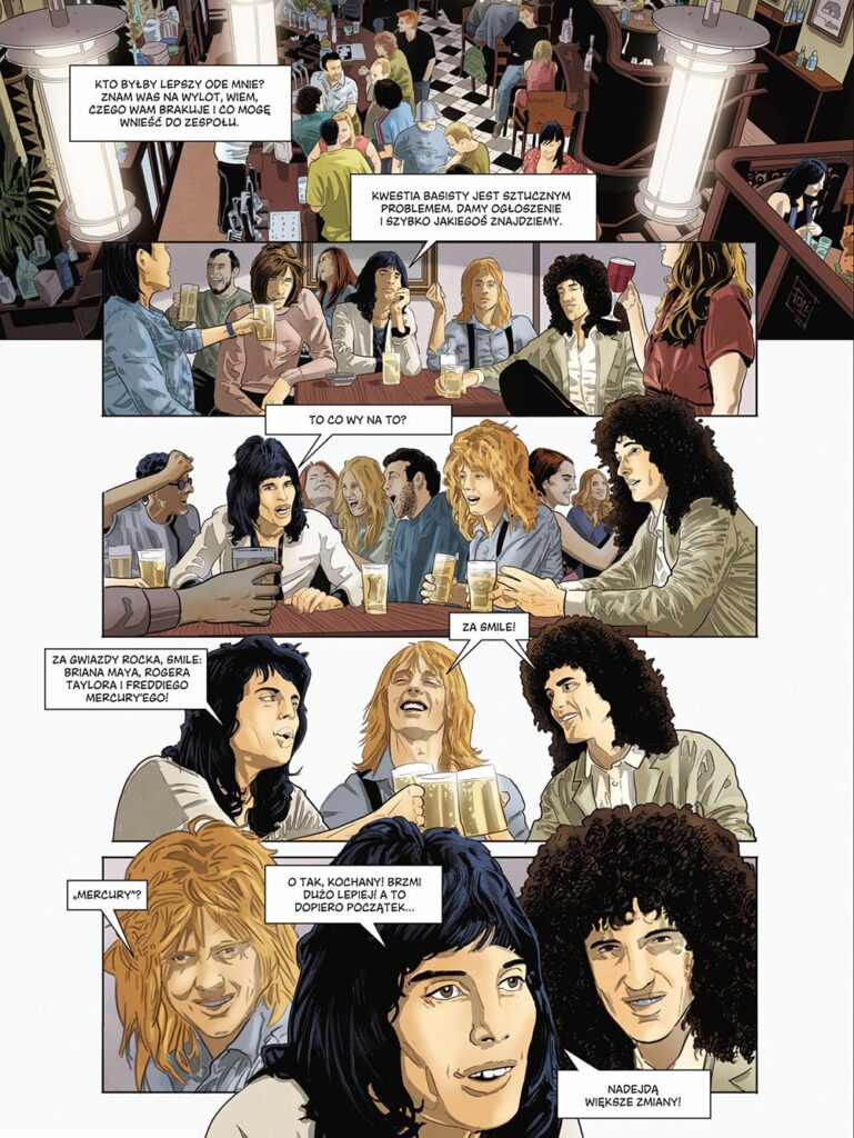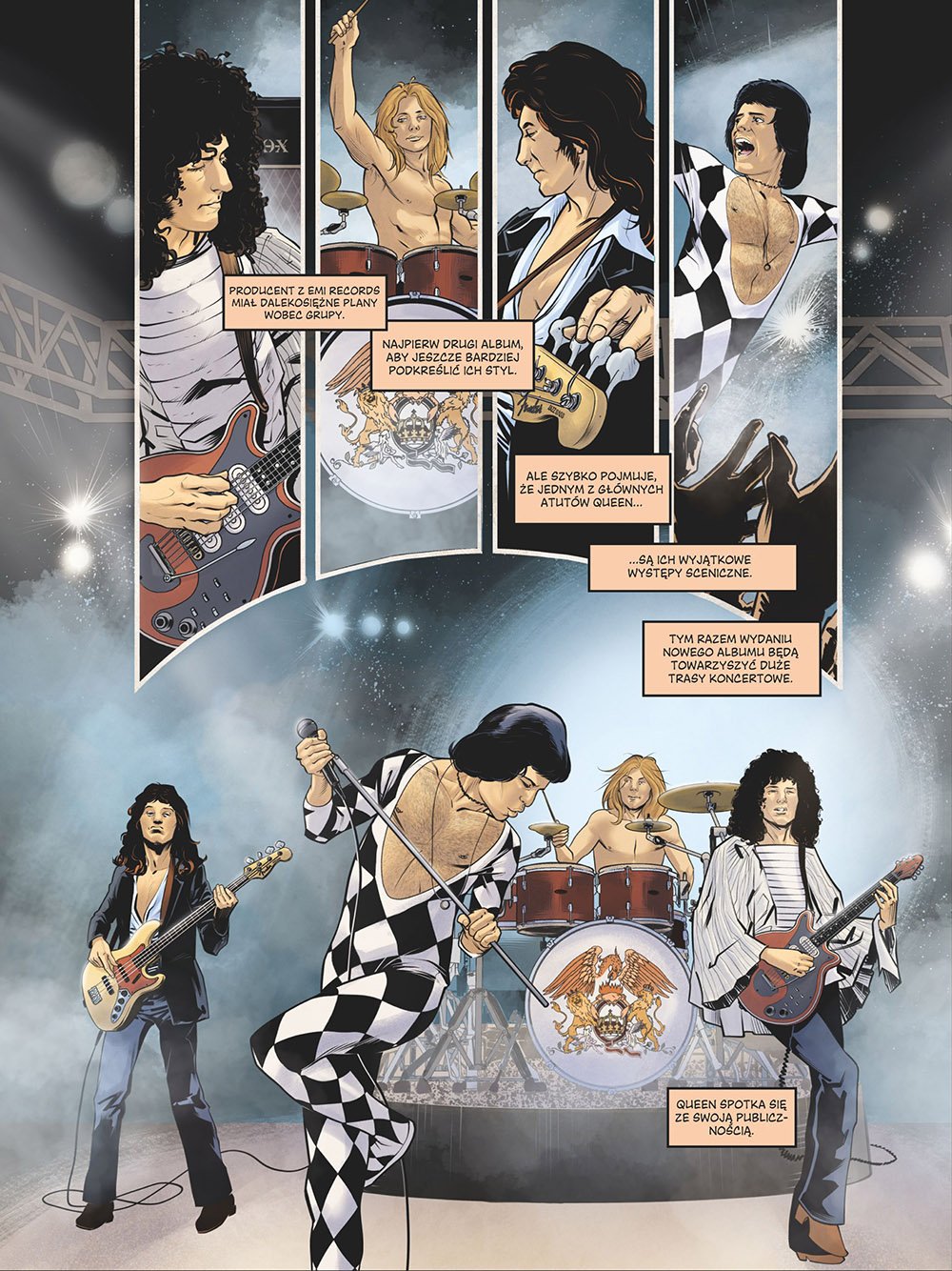 Queen to wszystko, co powyższe, i wiele więcej. Dzięki temu komiksowi dokumentalnemu odkryjecie historię zespołu – pioniera współczesnego teledysku; grupy potrafiącej ekstrawagancko przeplatać rock, jazz, heavy metal i operę!