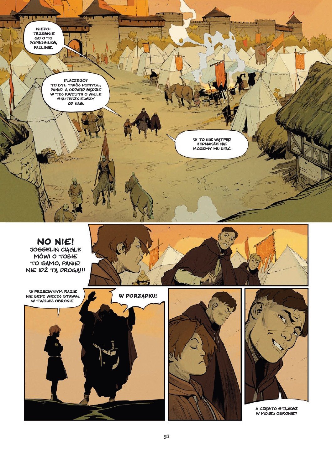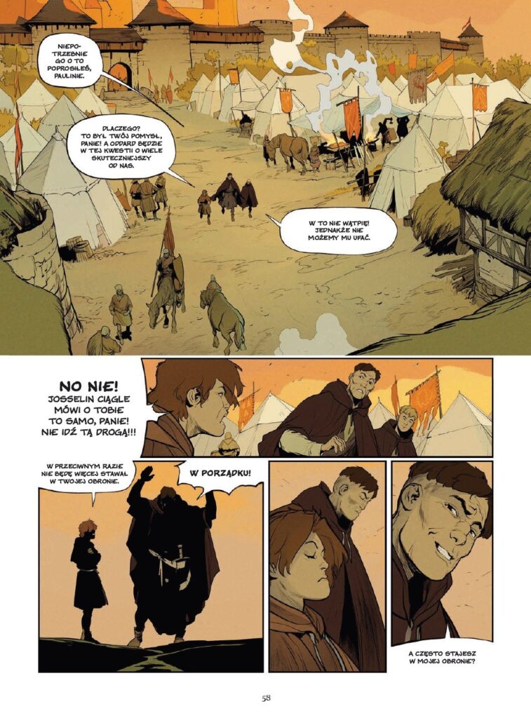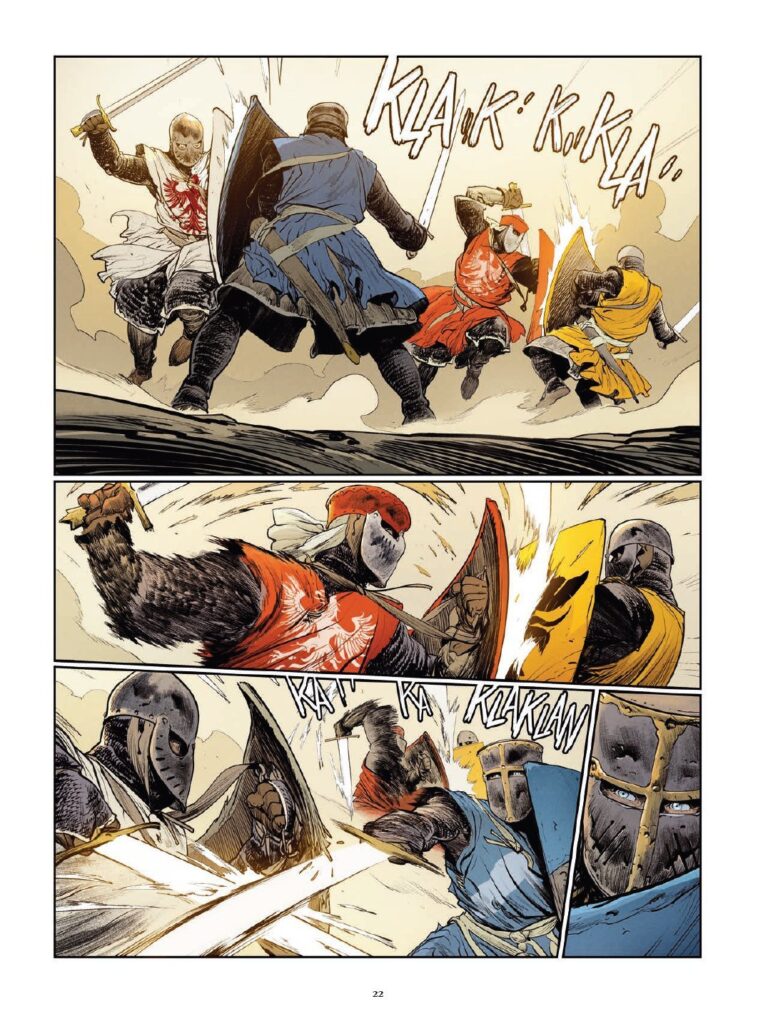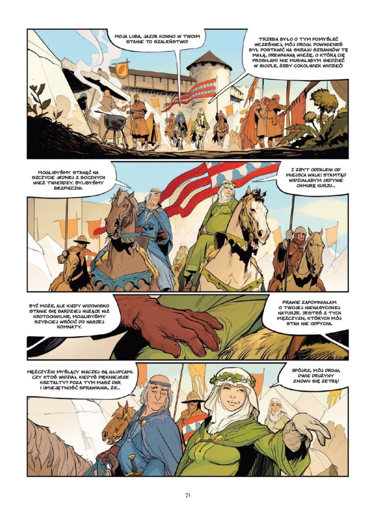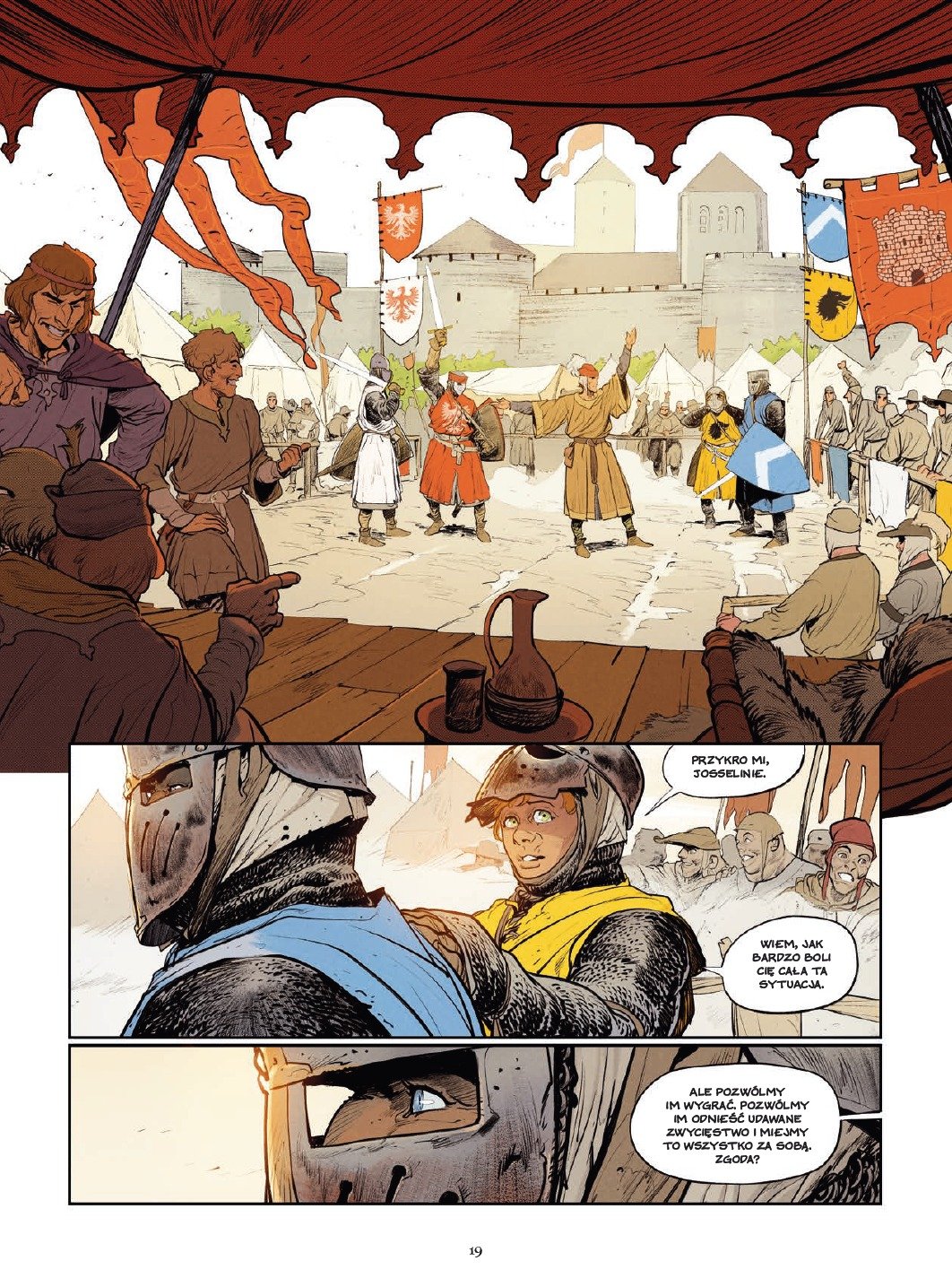 Fabularnie znajdziemy tutaj lekkość, starannie kamuflowaną ironię i wspomnianą dekonstrukcję rycerskiego etosu. Jak dalece to możliwe, Vincent Brugeas – autor scenariusza – stara się podążać za historycznymi faktami, oddając starannie realia epoki oraz obrazując bez upiększeń świat rycerzy i rycerskich turniejów. A wszystko to podparte realistycznymi, starannymi szkicami, za które odpowiada Ronan Toulhoat. Duet ten nie jest raczej obcy polskiemu czytelnikowi, bo ukazały się w naszym kraju (również nakładem Lost In Time), takie znakomite albumy tej dwójki, jak choćby „Król rozpustników”, czy „Republika czaszki”.