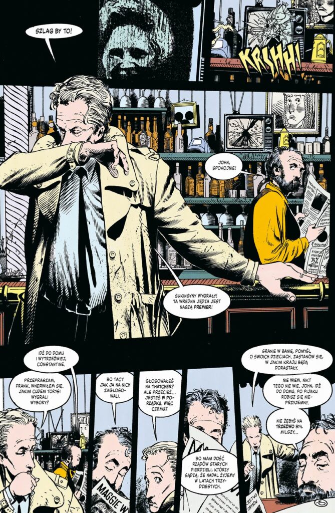 Nie kto inny, tylko Peter Milligan kończył sagę “Hellblazera” w Vertigo, więc jak widać, dzięki niniejszej historii miał już odpowiedni trening. Zresztą na pokrewieństwo stylistyki “Shade’a. Człowieka przemiany” z historią o Constantinie zwracałem uwagę podczas lektury poprzedniego tomu, szczególnie w stosowaniu przez twórców poetyki horroru. “Do “Lekcji historii” idealnie pasują mocno vertigowskie rysunki Chrisa Bachalo, a jego wyraźnie zmęczony życiem (ale wciąż skuteczny) Constantine to klasa sama w sobie. To zresztą najciekawiej napisany bohater w tej krótkiej (trzy zeszyty), acz intensywnej opowieści i do niego należą jej ostatnie kadry. Choćby dla “Lekcji historii” warto sięgnąć po czwarty tom komiksu Milligana, a tymczasem po tym historycznym wprowadzeniu, scenarzysta skupia się na zaprojektowaniu złożonego konfliktu, który ma zatrząść życiem wszystkich bohaterów.