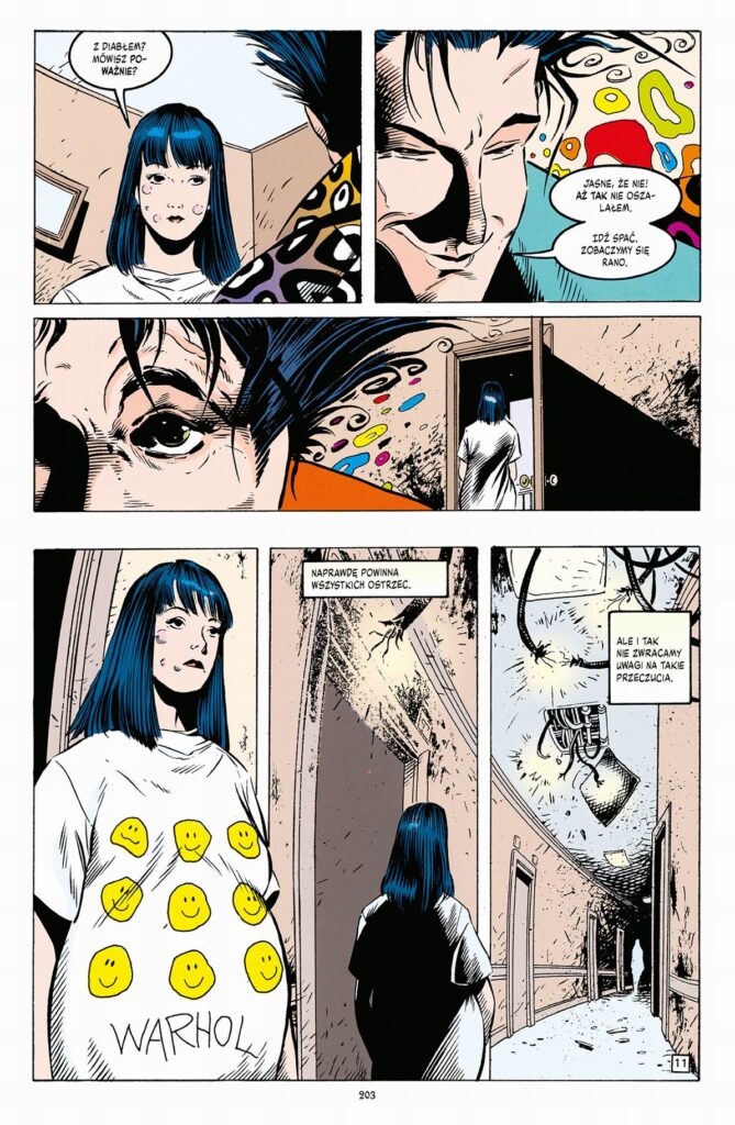W czwartym tomie serii momenty przejmujące i szalone nieustannie się przeplatają, pojawiają się też - dołączając do Shadowej gromadki - nowi i jak się okazuje istotni dla wymowy dzieła bohaterowie. Dajmy na to Shimmy, określający się jako ożywione dzieło sztuki, Pandora wprost z greckiej mitologii, czy nastoletnia Lilly aka Lilith, której obecność bardzo wpłynie na Lenny. A i tak największą ekstrawagancją Milligana jest cudaczne podsumowanie swojego dzieła po pięćdziesiątym numerze. Cudaczne i ekstrawaganckie, bo oparte na ewolucji fryzur bohaterów w całej dotychczasowej serii. Przyznam, że tym tekstem Milligan mnie i rozbawił, i wzbudził rodzaj podziwu, bo w ten sposób zaprasza czytelnika do swojej literackiej gry, z której sam czerpie wiele radości i chce, by tę radość (oprócz wspomnianej wyżej dezorientacji) poczuł również odbiorca. I ja ją czuję, podobnie jak podczas lektury innych serii Vertigo, które przez lata dawały mi moc naprawde niezwykłych literackich wrażeń.