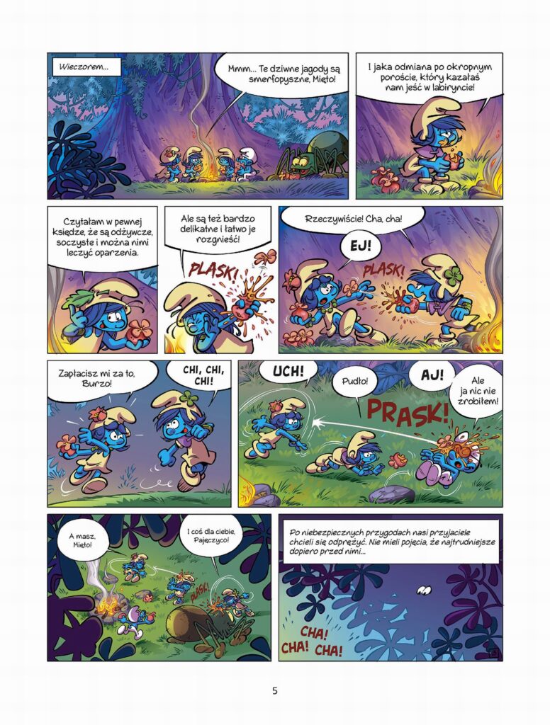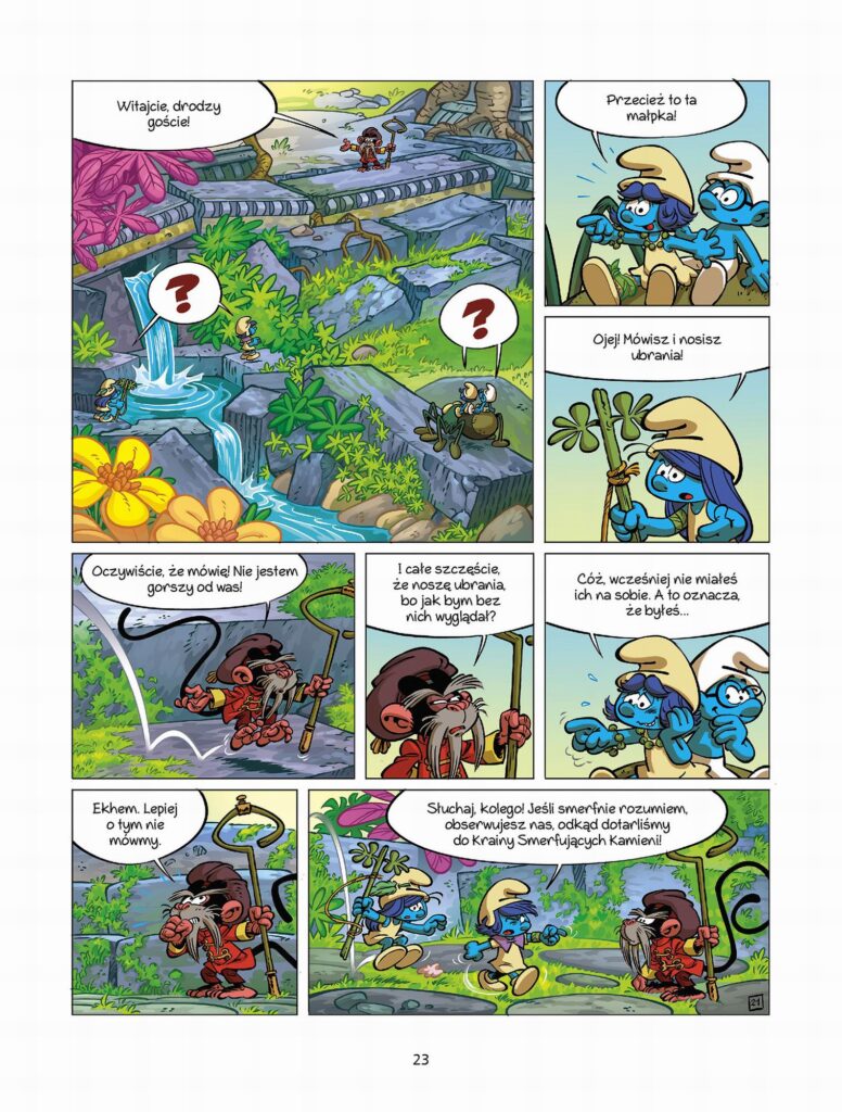 Siódma część opowieści poświęconej dziewczynom Smerfom, a jednocześnie zakończenie trylogii o szalonej wyprawie na koniec świata. Mięta, Burza i Jaskierka oraz Ważniak docierają do legendarnej Krainy Smerfujących Kamieni. Wydaje im się, że są zaledwie o krok od celu podróży, ale nie mają pojęcia, jak trudne wyzwania czekają ich jeszcze w dżungli i pośród pradawnych ruin. Czy zdołają odnaleźć magiczne źródło i czy tamtejsza woda naprawdę ma leczniczą moc?