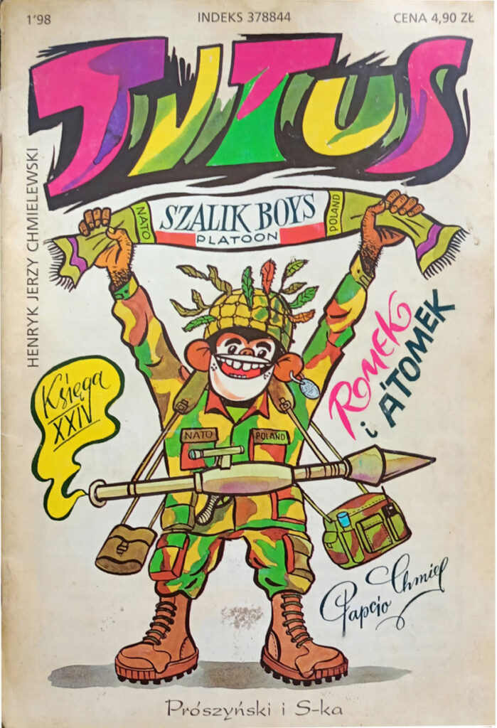 Tytus z karabinem. A miał się uczłowieczać. Rozbrykani dawniej Tytus, Romek i A’Tomek dzisiaj spoważnieli. Papcio Chmiel nie chce już rysować swoich bohaterów jako dzieci. Mają w końcu po… 40 lat. W tej księdze autor połączył jak najwięcej elementów współczesności, zdominowanej przez przemoc. Są kibice-szalikowcy, zjawisko fali w wojsku, wejście Polski do NATO i interwencja międzynarodowych sił zbrojnych podczas lokalnego konfliktu. Psy lub demony wojny – zgoda. Ale małpa w NATO? To brzmi dziwacznie! Na końcu Tytus więc mówi „aha, już wiem, w co weszliśmy”. Wdepnęliśmy?