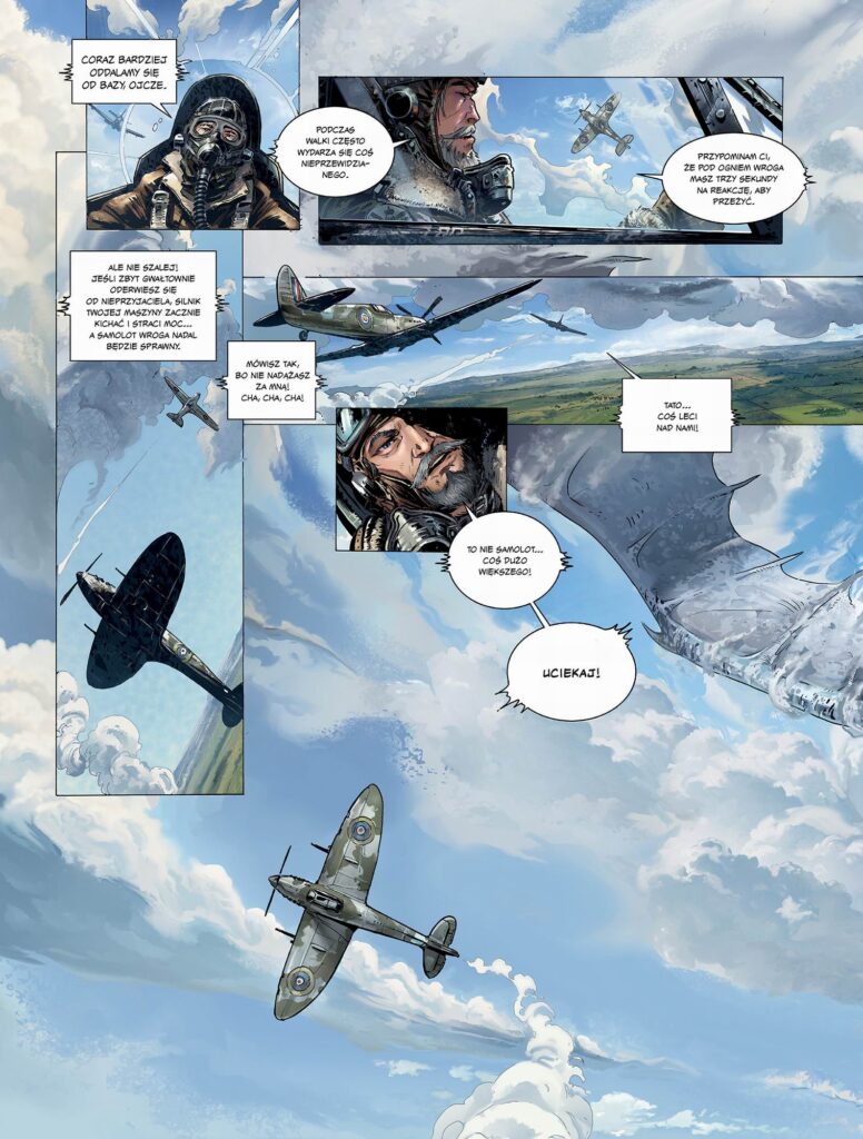 Komiksy ze scenariuszami francuskiego twórcy już na dobre zadomowiły się na naszym rynku wydawniczym, choćby za sprawą “Świata Akwilonu”, którego Jarry jest jednym z głównych architektów. Jego najnowszy tytuł, czyli wydane przez Egmont ‘Wojny i smoki” zdają się być odskocznią od rozległego świata fantasy, choć i tak zapożyczają - przynajmniej jak na razie jeden element z tego właśnie gatunku literackiego. Jest on jasno deklarowany w tytule całej serii, jednak już w samym tytule pierwszego tomu nie jest to tak oczywiste. Fraza “Bitwa o Anglię” kojarzy nam się przede wszystkim z wojna powietrzną z hitlerowskimi Niemcami i rzeczywiście ten wycinek drugiej wojny światowej dostajemy w komiksie. Plus widoczne na okładce na tle walczących samolotów smoki, co samo w sobie jasno nam mówi, że będziemy mieli do czynienia z historią alternatywną z elementami fantasy. Pytanie, jak ów pomysł sprawdza się w praktyce?