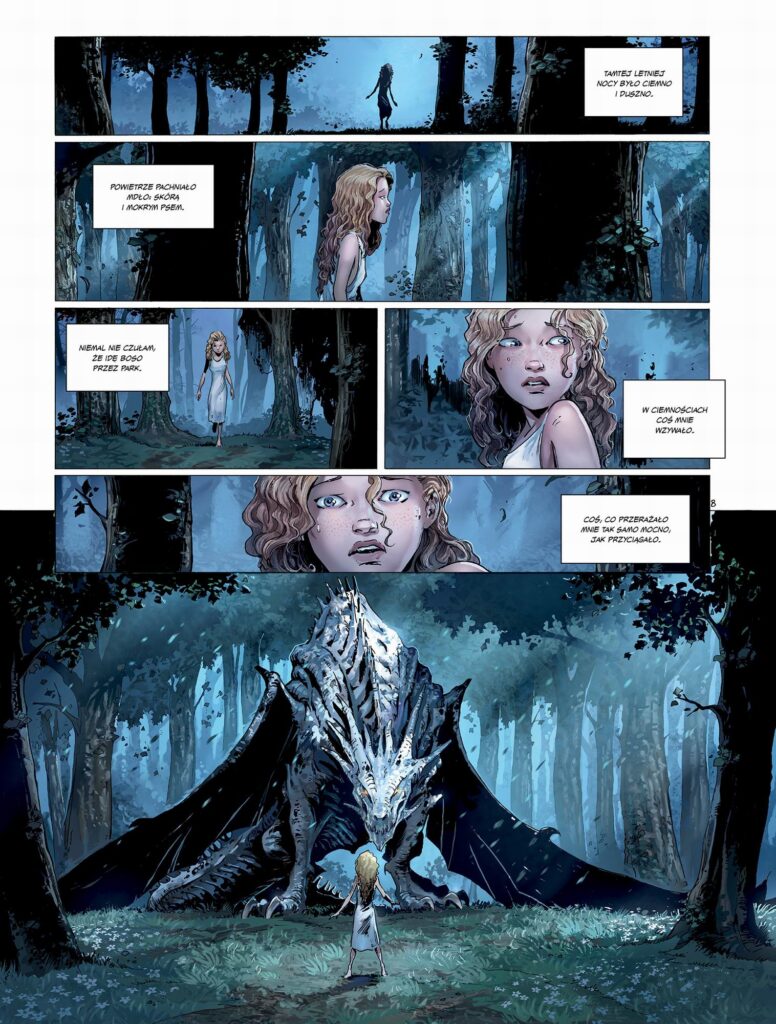 W drugiej połowie komiksu historia coraz bardziej skupia się na nastoletniej Aleksandrze, którą łączy ze smokiem specjalna więź. W międzyczasie przechodzi ona szybko szkołę życia w ciężkich warunkach i zarazem kurs dojrzewania. Połączone razem skutkują one czymś, co potrafi zaskoczyć, ponieważ ma konotacje patriotyczne. W czasach kiedy popularność święcą powieści romantasy takie podejście, taki rodzaj oświecenia duchowego zasługuje na uwagę i jest chyba najważniejszym czynnikiem, kory każe nam sprawdzić jak ów koncept rozwinie Jarry w kolejnym tomie. Bo nie licząc tego właśnie wyeksponowanego, patriotycznego elementu, cała historia wygląda jak na razie po prostu przeciętnie, a połączenie smoków z realiami drugiej wojny światowej nie działa na wyobraźnię tak, jak powinno.