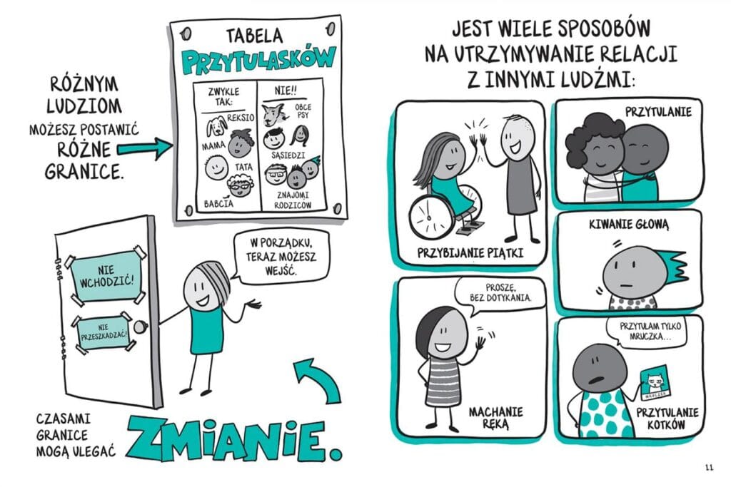 Autorka ilustruje każdy przykład komiksowym rysunkiem, który podpowiada dzieciom, jak jasno komunikować własne potrzeby, szanując przy tym granice innych ludzi.