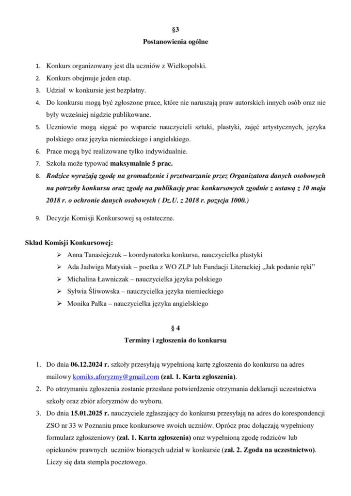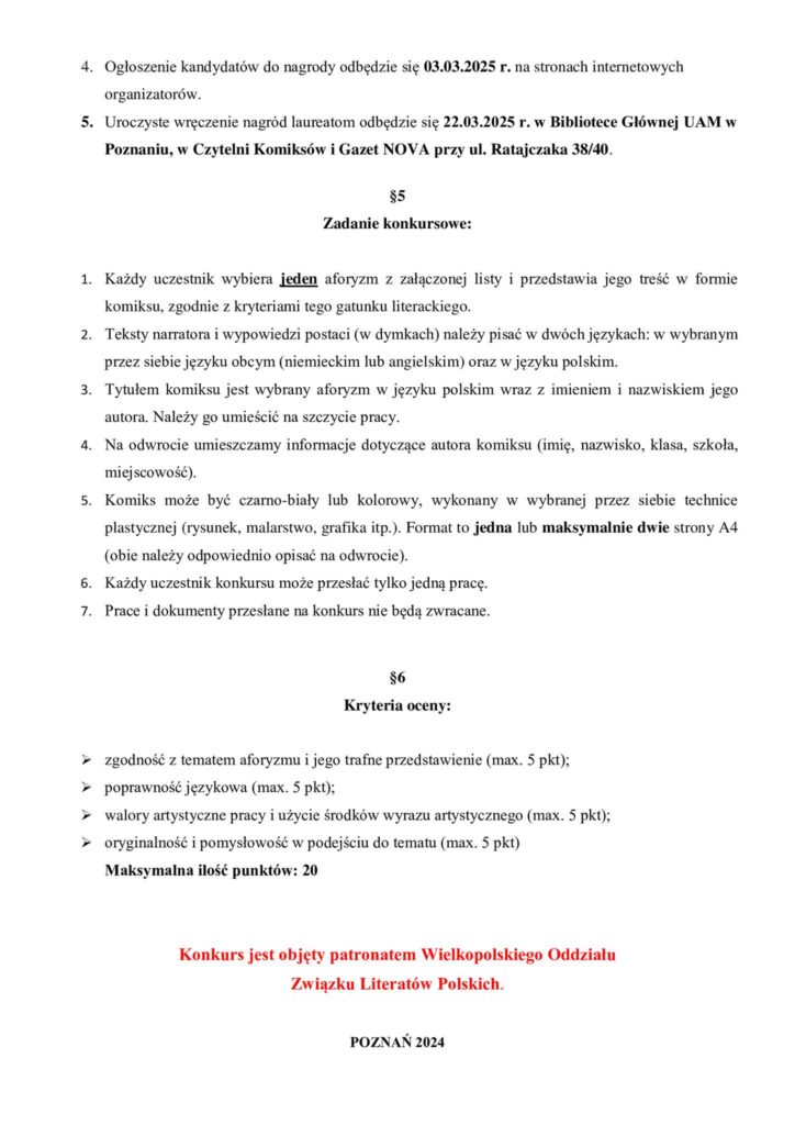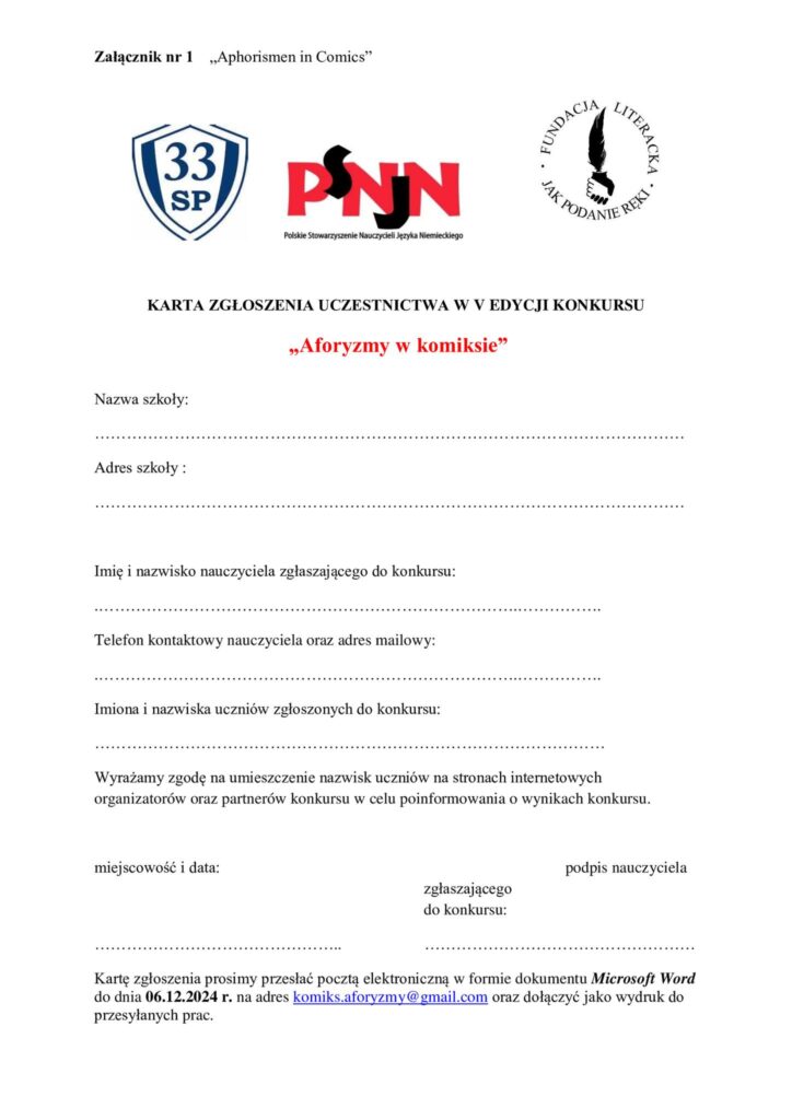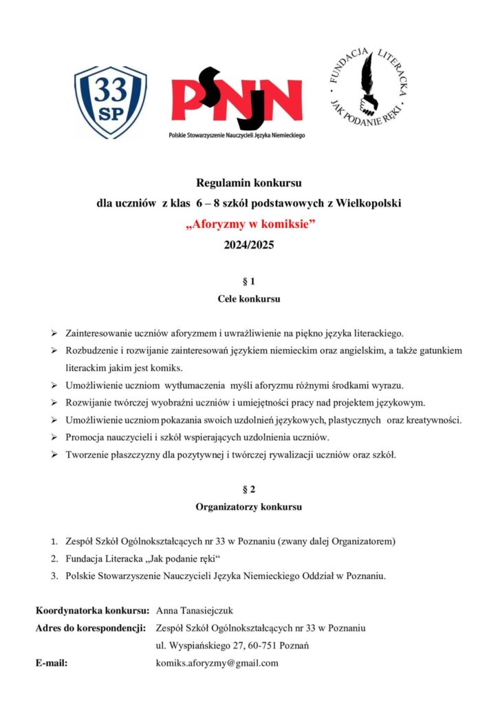 Szkoła Podstawowa nr 33 w Poznaniu, Fundacja Literacka „Jak podanie ręki“ oraz Polskie Stowarzyszenie Nauczycieli Języka Niemieckiego Oddział w Poznaniu zapraszają uczniów szkół podstawowych z klas 6, 7 i 8 z Wielkopolski do udziału w V edycji wojewódzkiego konkursu: „Aforyzmy w komiksie”.