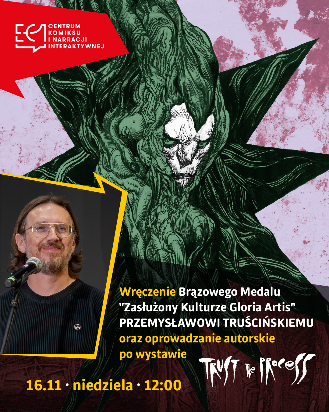 Centrum Komiksu i Narracji Interaktywnej EC1 zaprasza na autorskie oprowadzanie po wystawie TRUST the process oraz uroczyste wręczenie Przemysławowi Truścińskiemu Brązowego Medalu „Zasłużony Kulturze Gloria Artis”. Start o godzinie 12:00. Wstęp biletowany.
