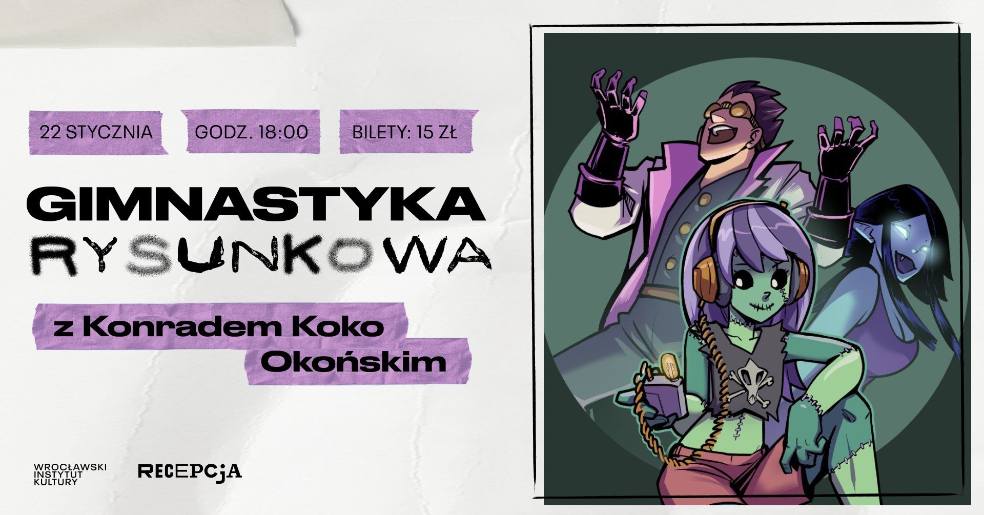Klubokawiarnia Recepcja zaprasza na warsztaty z Konradem Okońskim pn. Gimnastyka rysunkowa. Wstęp 15 zł, bilety do nabycia tutaj.