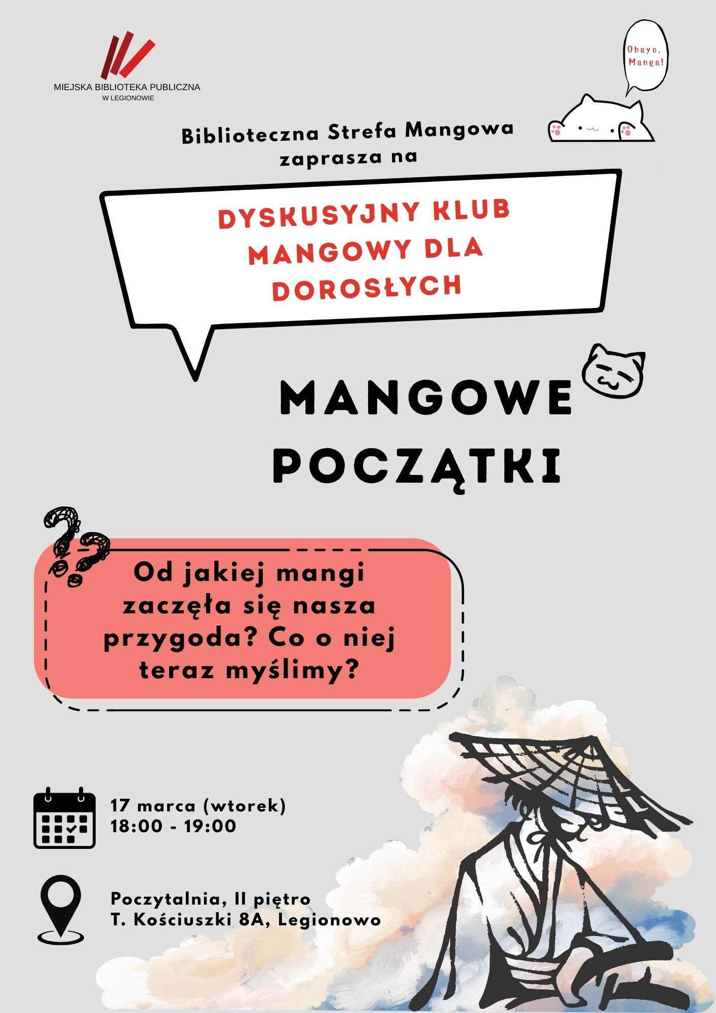 Miejska Biblioteka Publiczna w legionowie zaprasza na kolejne spotkanie Dyskusyjnego klub mangowego dla dorosłych, którego tematem będą mangowe początki. Start o godz. 18:00, wstęp wolny.