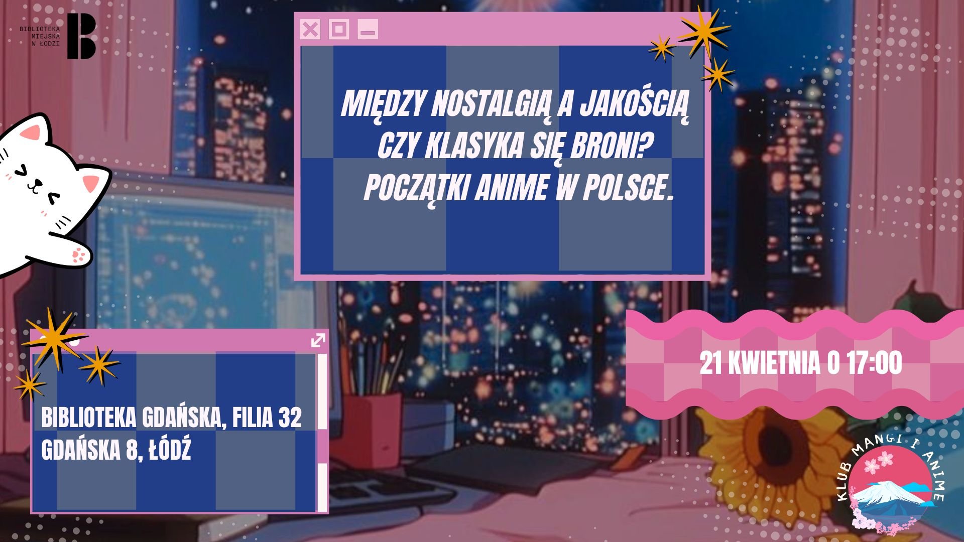 Zapraszamy na kolejne spotkanie Klubu Mangi i Anime, które tym razem będzie prawdziwą podróżą w czasie! Cofniemy się do lat, kiedy to pierwsze japońskie animacje podbijały polską telewizję i serca widzów. Podczas spotkania w formie krótkiego wykładu i otwartej dyskusji porozmawiamy o klasycznych anime, które zdobyły w Polsce ogromną sympatię i na stałe zapisały się w popkulturze. Będzie to okazja, by wspólnie powspominać kultowe tytuły, zastanowić się nad ich fenomenem i wymienić się własnymi doświadczeniami oraz refleksjami.