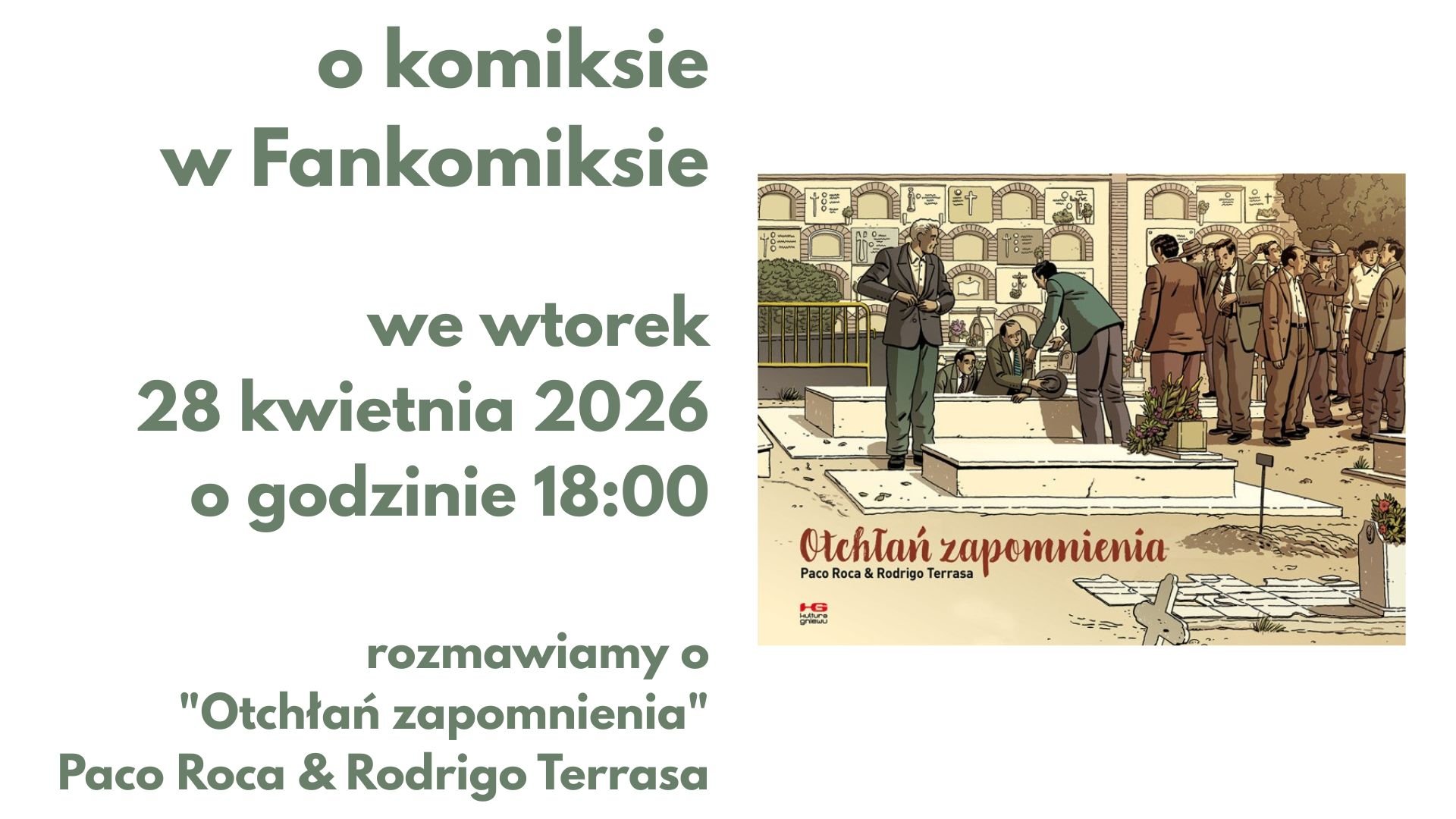 Księgarnia Fankomiks zaprasza na rozmowę o komiksie Otchłań zapomnienia Paco Roca i Rodrigo Terrasa. Start o godz. 18:00, wstęp wolny.