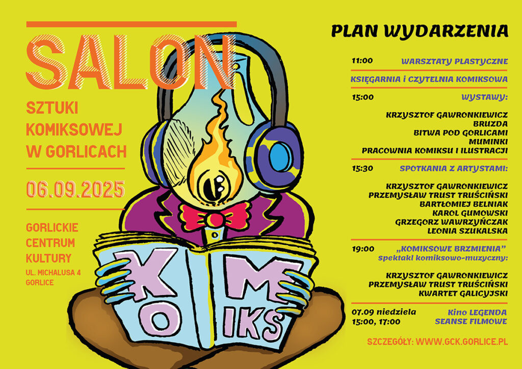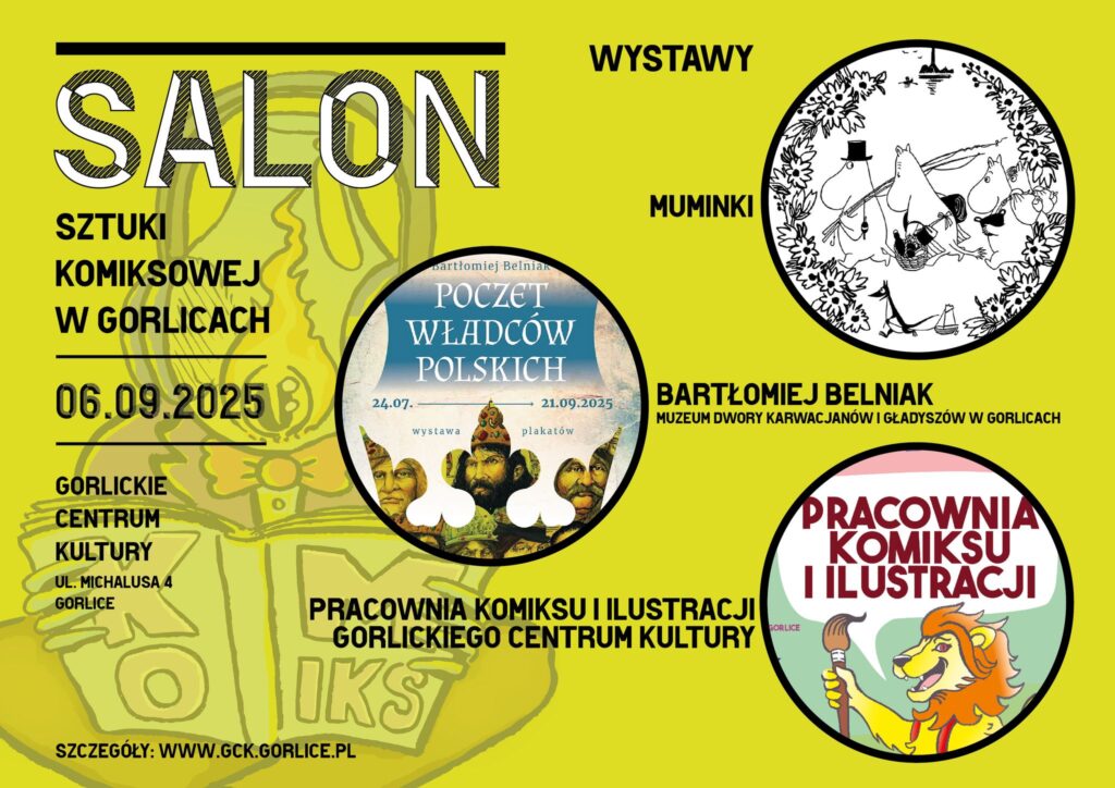 SALON Sztuki Komiksowej w Gorlicach jest pierwszą edycją komiksowego wydarzenia organizowanego przez Gorlickie Centrum Kultury, które odbędzie się 6 września 2025. Przestrzenie instytucji kultury wypełnią się atrakcjami dla miłośników sztuk wizualnych, muzyki, literatury i komiksów. Start o godz. 11:00.