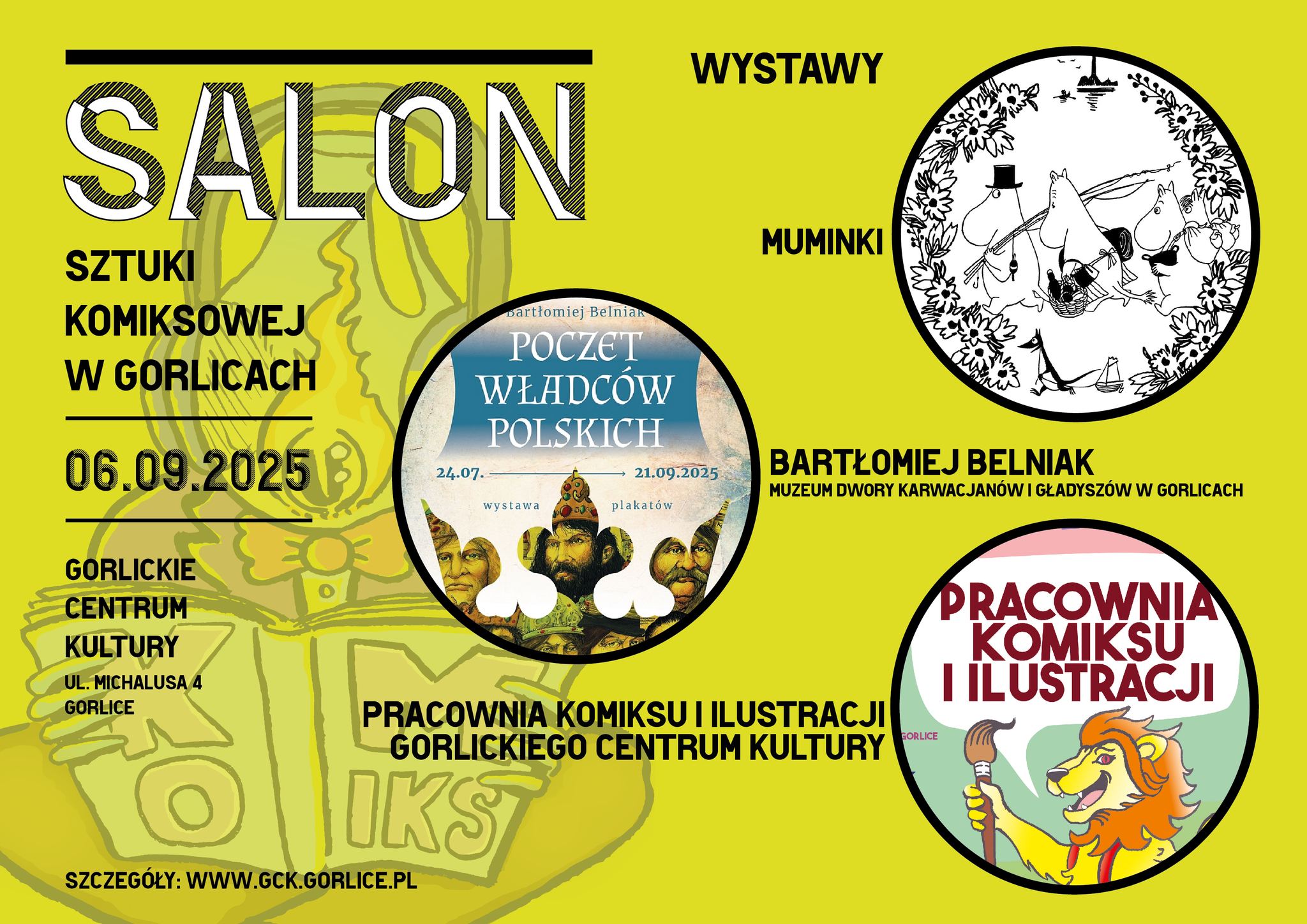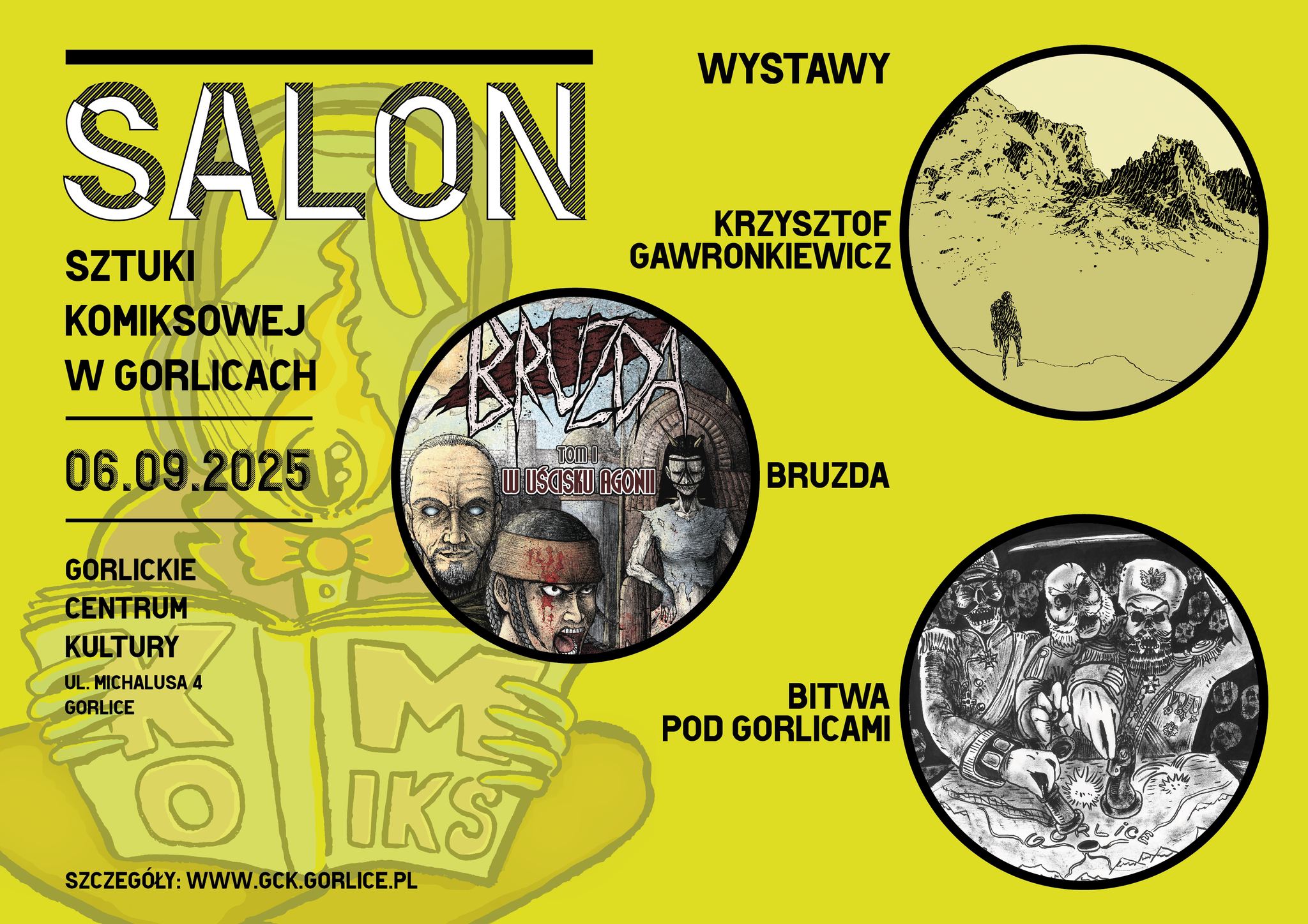 W przestrzeniach ekspozycyjnych Gorlickiego Centrum Kultury odbędą się wystawy sztuki komiksowej i ilustracji. W pierwszej edycji SALONu przedstawimy bogaty przekrój twórczości Krzysztofa Gawronkiewicza, plansze z komiksu „Bruzda”, którego scenariusz jest autorstwa gorliczanina – Karola Gumowskiego, komiks powstały w ramach obchodów 110. rocznicy Bitwy pod GorlicamiGrzegorza Wawrzyńczaka orazdzięki uprzejmości wydawnictwa Egmont zobaczymy plansze z komiksów autorstwa Tove Jansson – Muminki, które w tym roku obchodzą swoje osiemdziesięciolecie. Wyeksponowane zostaną również prace uczestników zajęć Pracowni Komiksu i Ilustracji Gorlickiego Centrum Kultury.