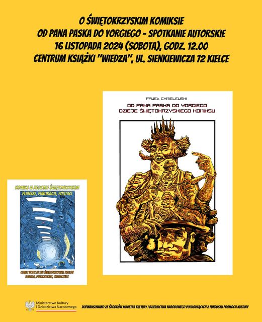 Centrum Książki „Wiedza” w Kielcach zaprasza na spotkanie autorskie z udziałem Pawła Chmielewskiego, autora książki „Od pana Paska do Yorgiego. Dzieje świętokrzyskiego komiksu„. Start o godzinie 12:00