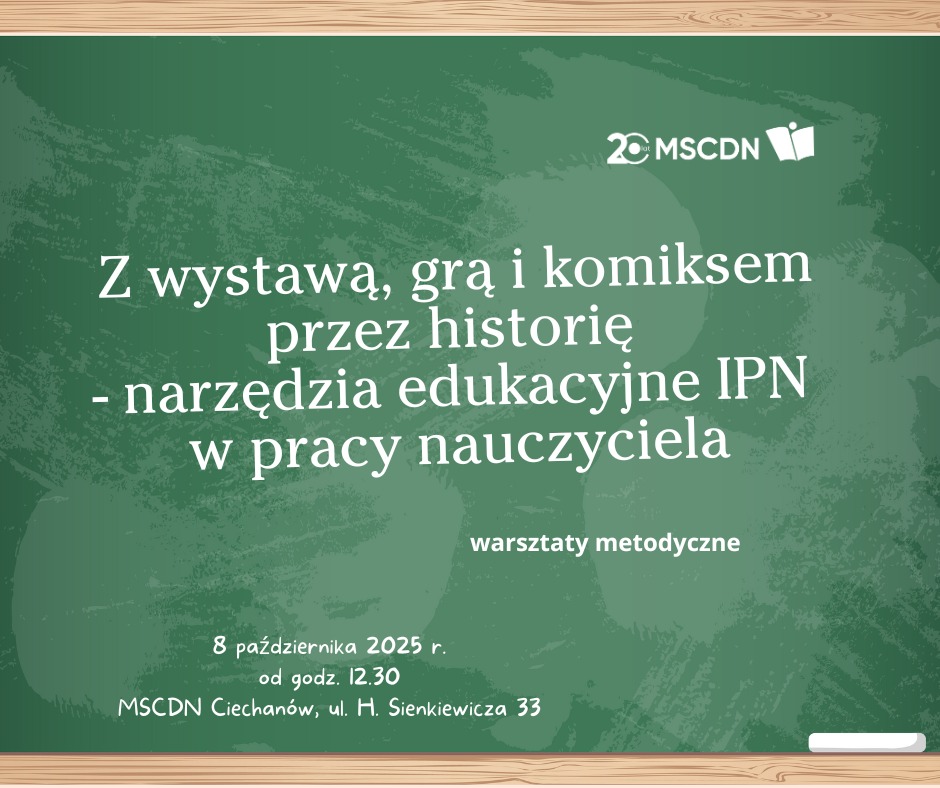 MSCDN Wydział w Ciechanowie oraz Instytut Pamięci Narodowej zapraszają nauczycieli na stacjonarne szkolenie pod nazwą Lekcja historii z grą edukacyjną lub komiksem. Czas trwania: 12.30 – 14.45. obowiązują zapisy przez formularz zgłoszeniowy.