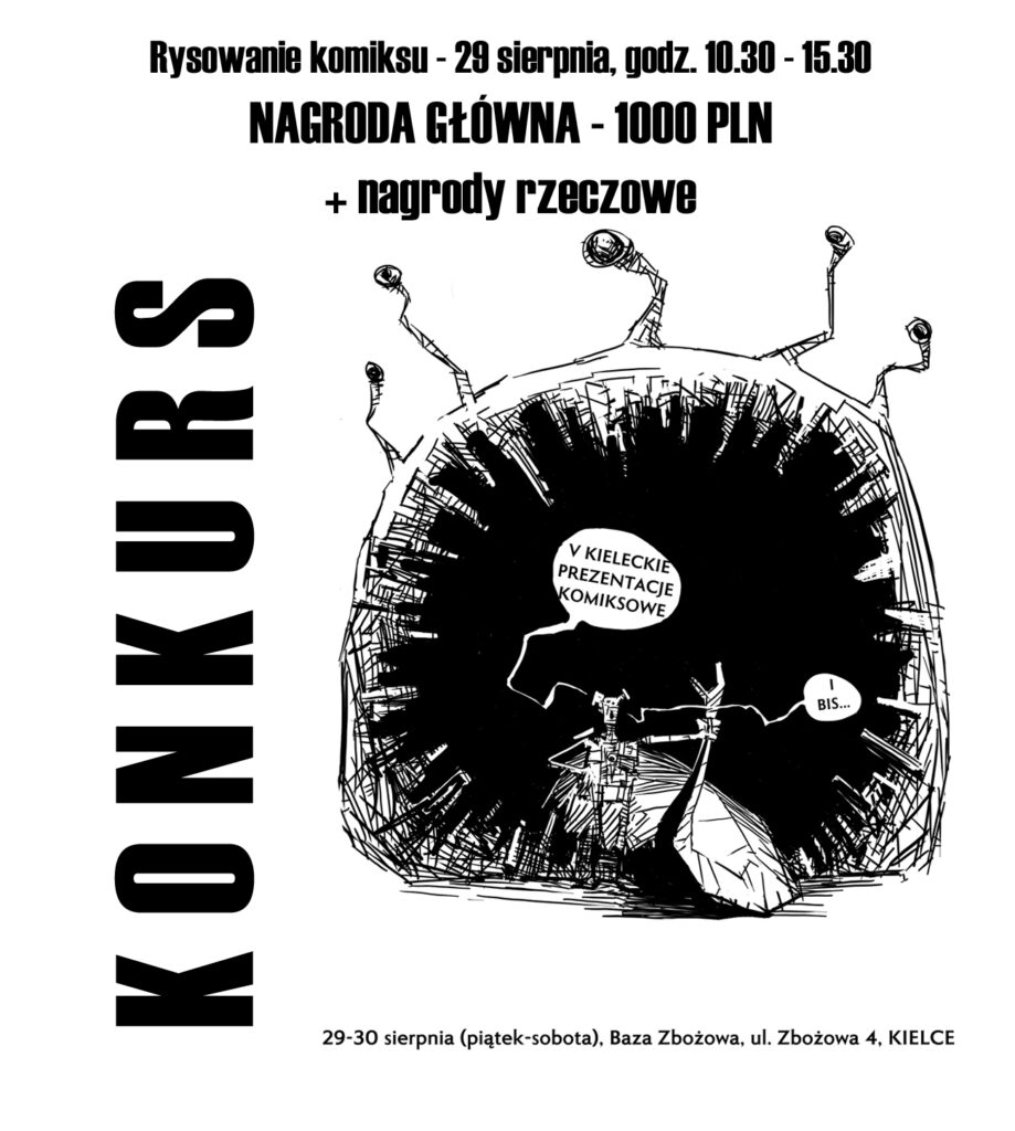 - godz. 10.30 – 15.30 – Konkurs rysowania komiksów (główna nagroda 1000 zł – cały teren Ośrodka Pracy Twórczej „Baza Zbożowa”)