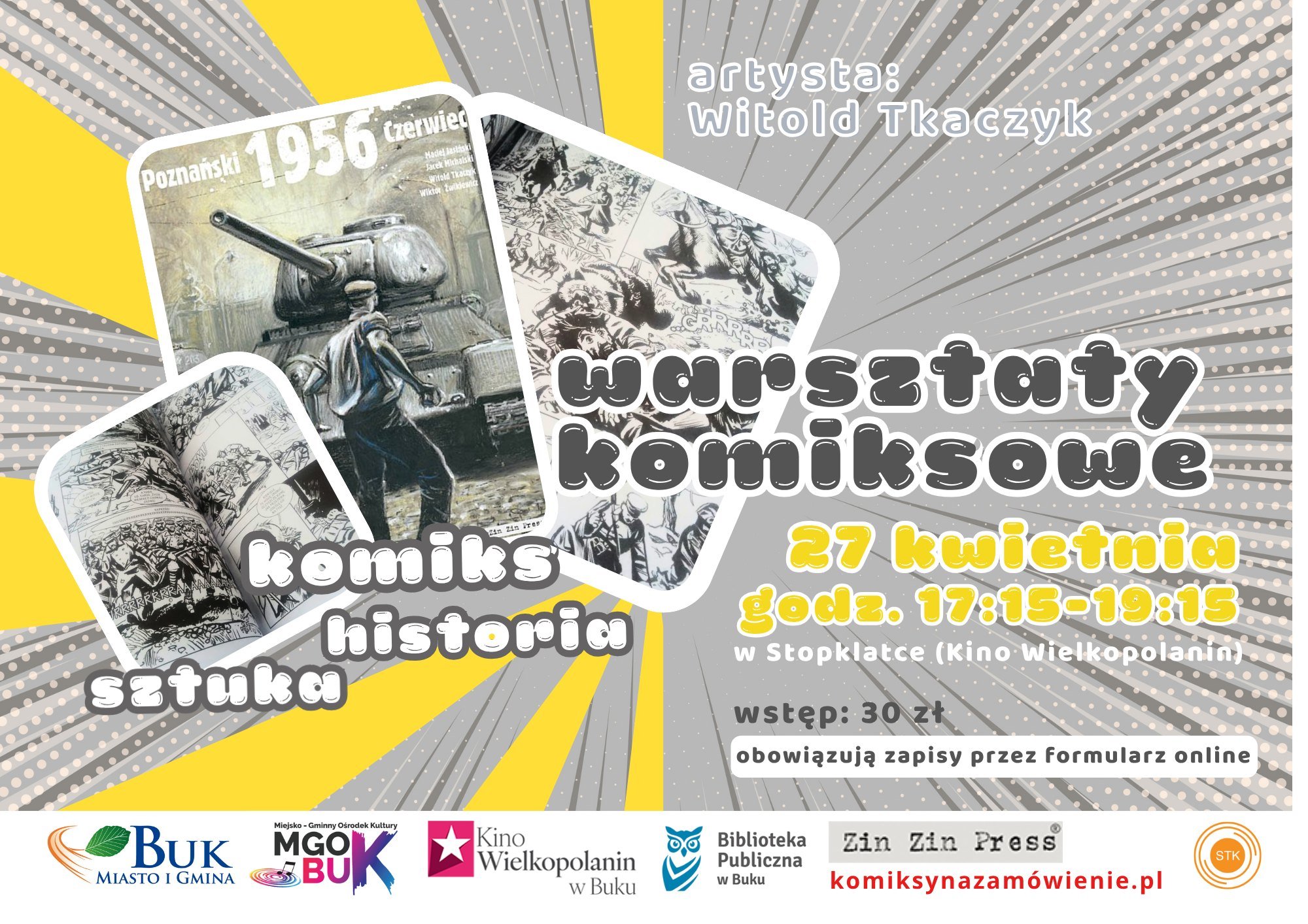 Miejsko-Gminny Ośrodek Kultury, Kino Wielkopolanin, Biblioteka Publiczna w Buku oraz Kawiarnia Stopklatka zapraszają na Warsztaty Komiksu Historycznego. Start o godz. 17:00.