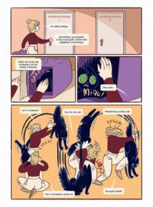 🟡Wiktor Talaga: Nie mogę powiedzieć, żebym sam znał na to jakąś konkretną, niezawodną metodę. Wydaje mi się, że razem z Olą chcieliśmy stworzyć komiks, który sami chętnie przeczytalibyśmy w naszej młodości. Coś, co nie traktuje dzieci z góry, podchodzi poważnie do ich inteligencji oraz emocji, a przy tym pokazuje, że to zwyczajne, codzienne życie też potrafi być ciekawe i pełne przygód (zwłaszcza w otoczeniu zwierzaków)! A i też myślę, że nasze okładki całkiem mocno wyróżniają się na tle innych tytułów dla dzieci. Zdecydowanie można je zauważyć już z daleka dzięki jaskrawym kolorom i dużej, przyjaznej buzi słodkiego kotka.